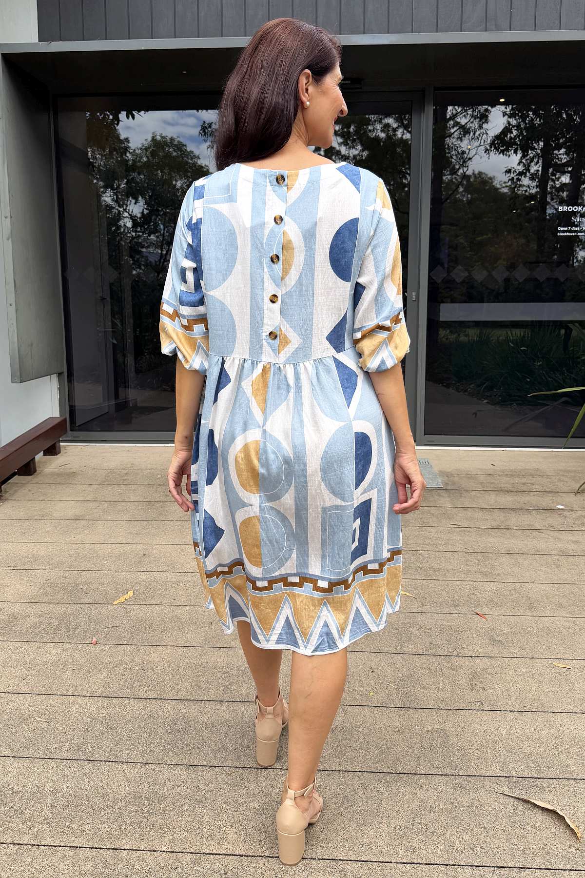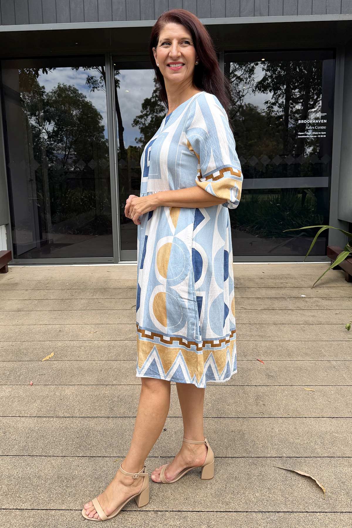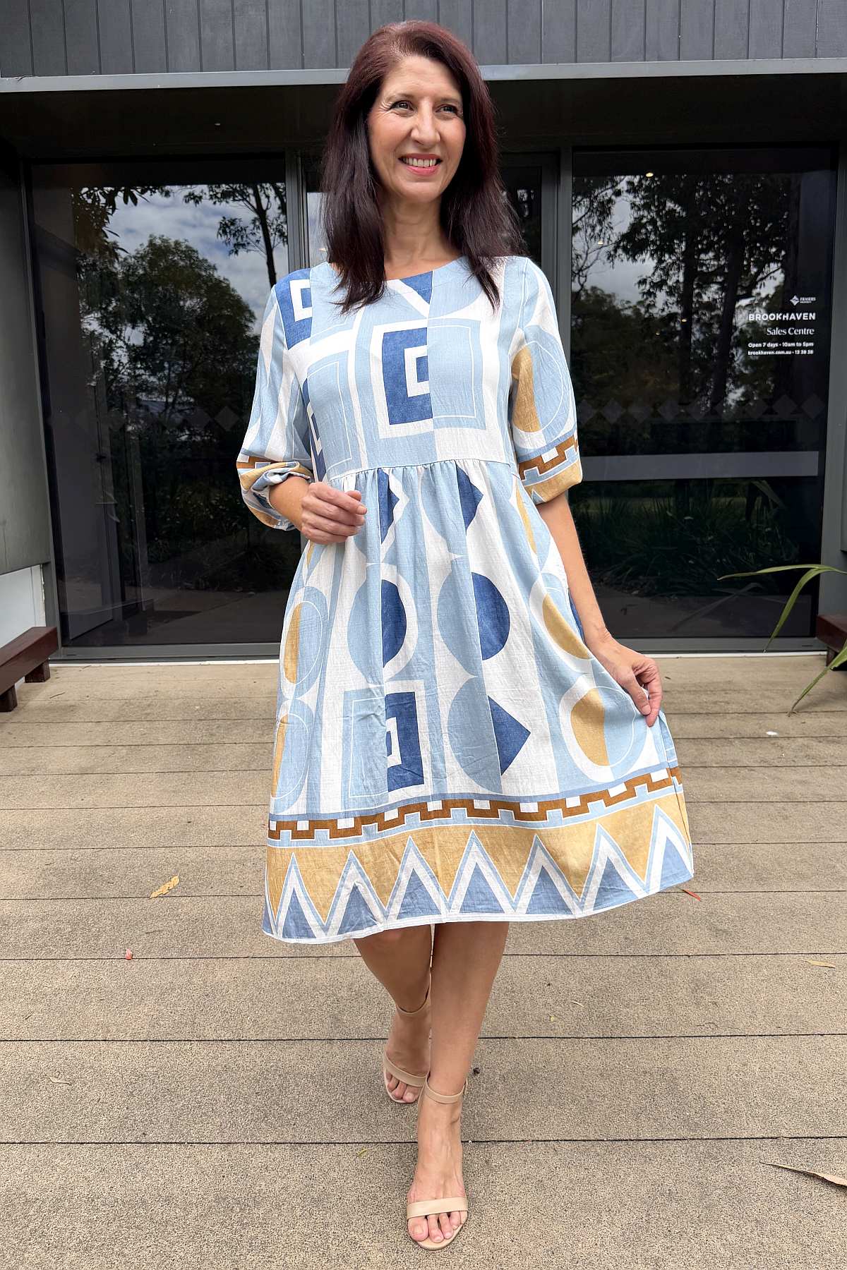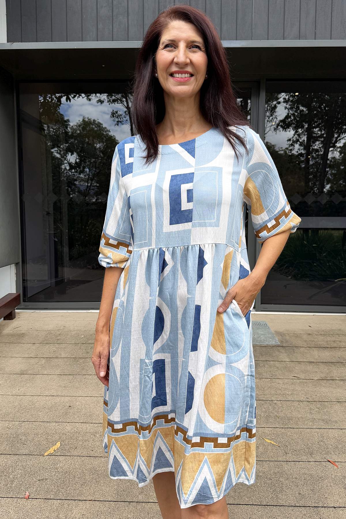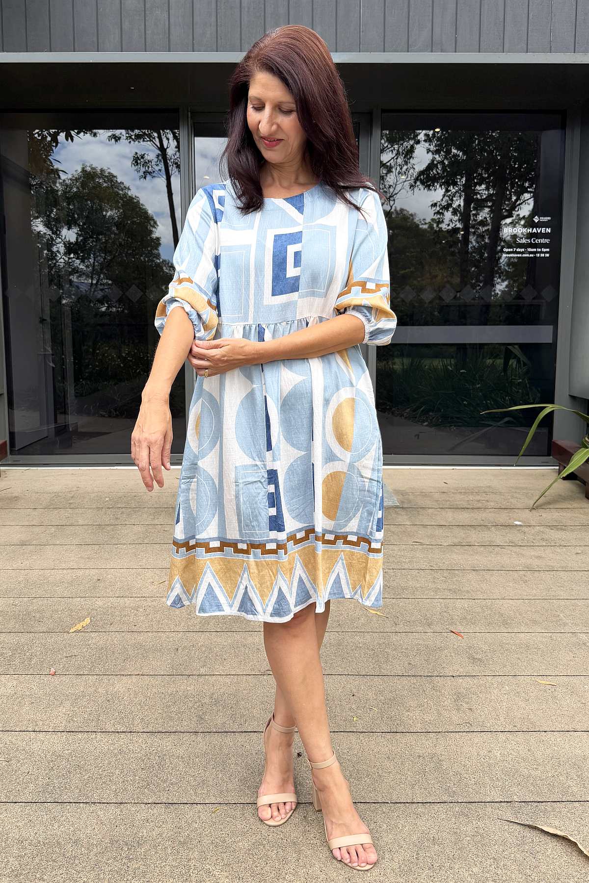 Regular price $69.99This refined tunic dress combines timeless style with everyday practicality. The premium cotton-rayon blend—65% cotton and 35% rayon—delivers a soft, luxurious drape without stretch, creating an effortlessly elegant silhouette. Bold geometric patterns in blue and beige pop against the crisp white background, with each piece featuring a unique print variation. The flattering A-line cut extends below the knee, while elbow-length sleeves with elasticated cuffs ensure comfort and ease of movement. A classic scoop neckline and subtle back button detail add refined touches, and functional side pockets provide practical appeal. A versatile wardrobe staple for the discerning wearer.