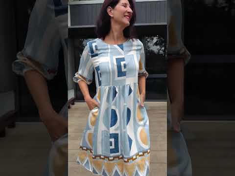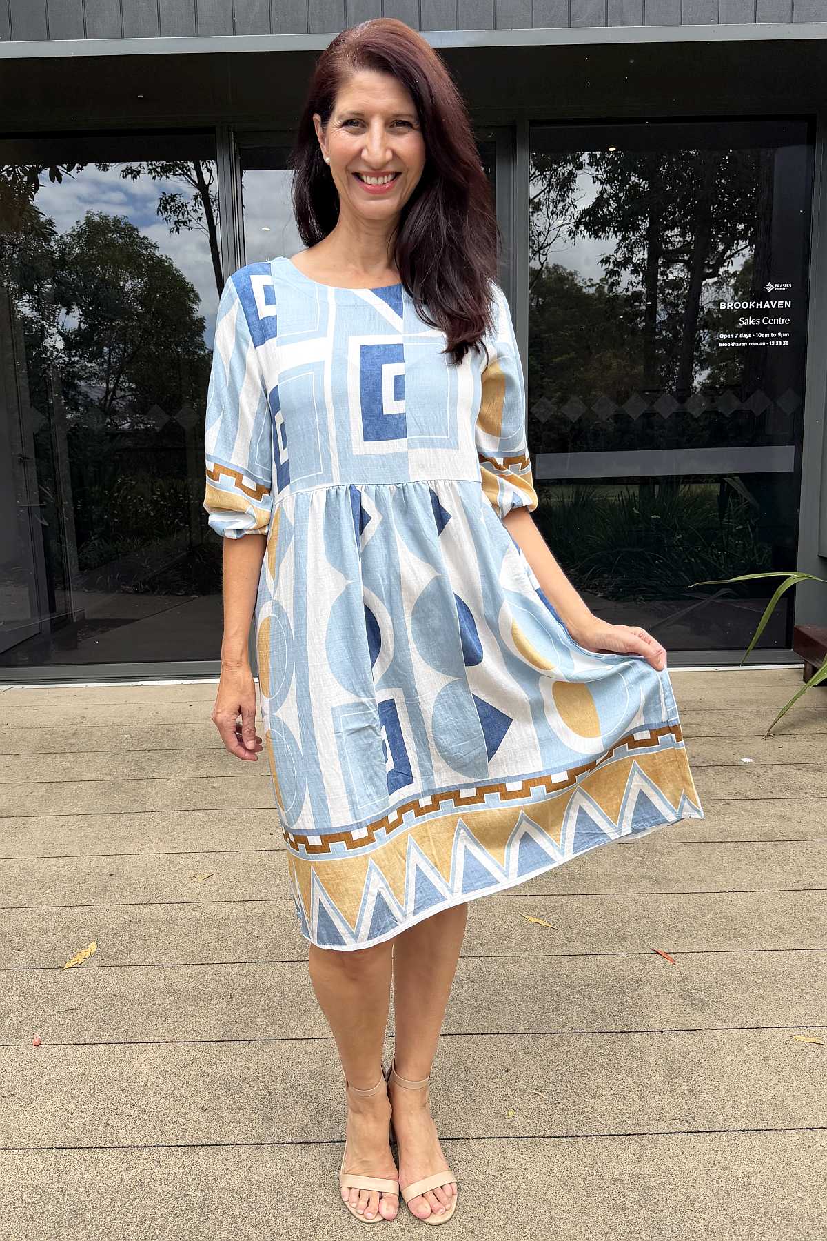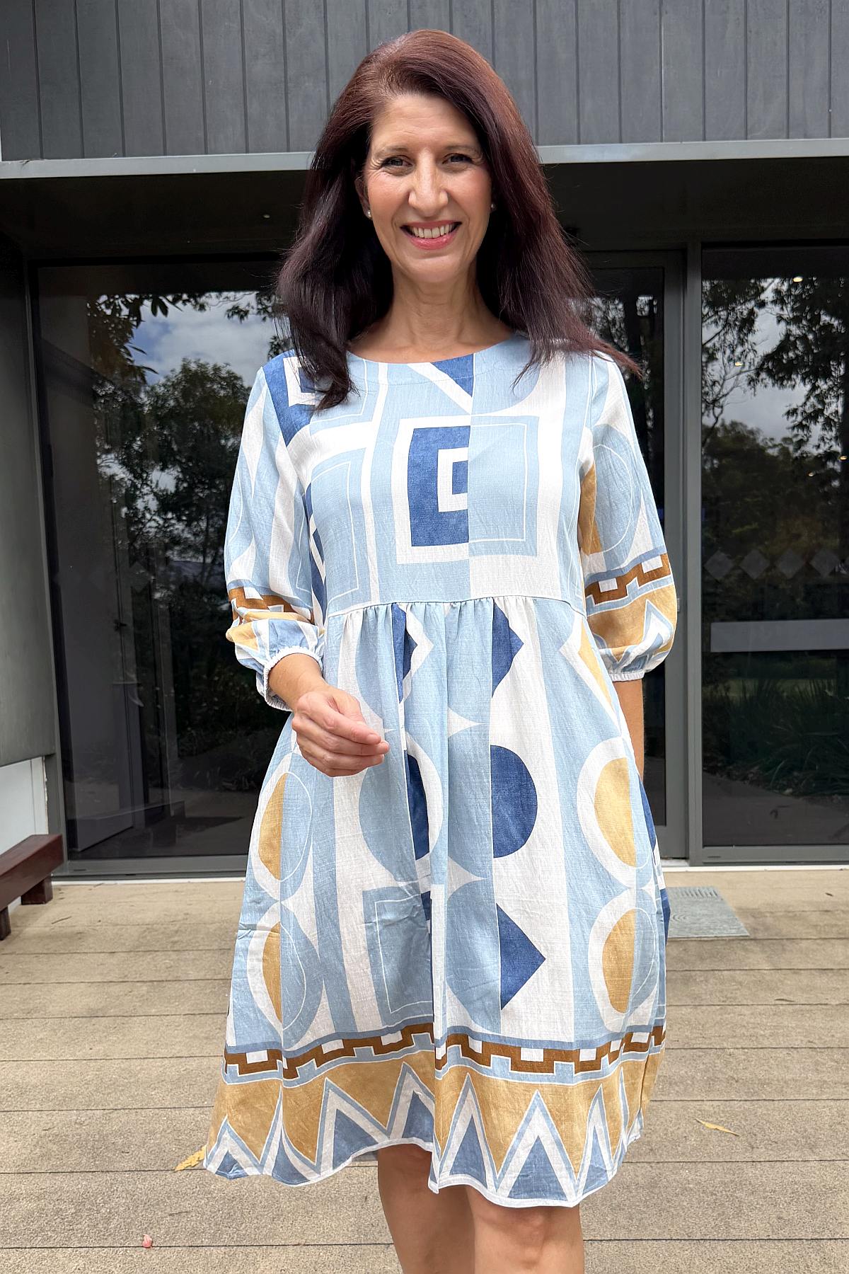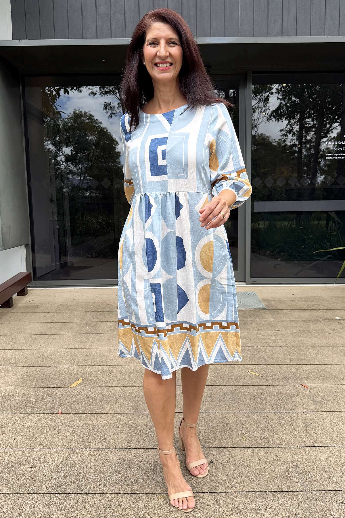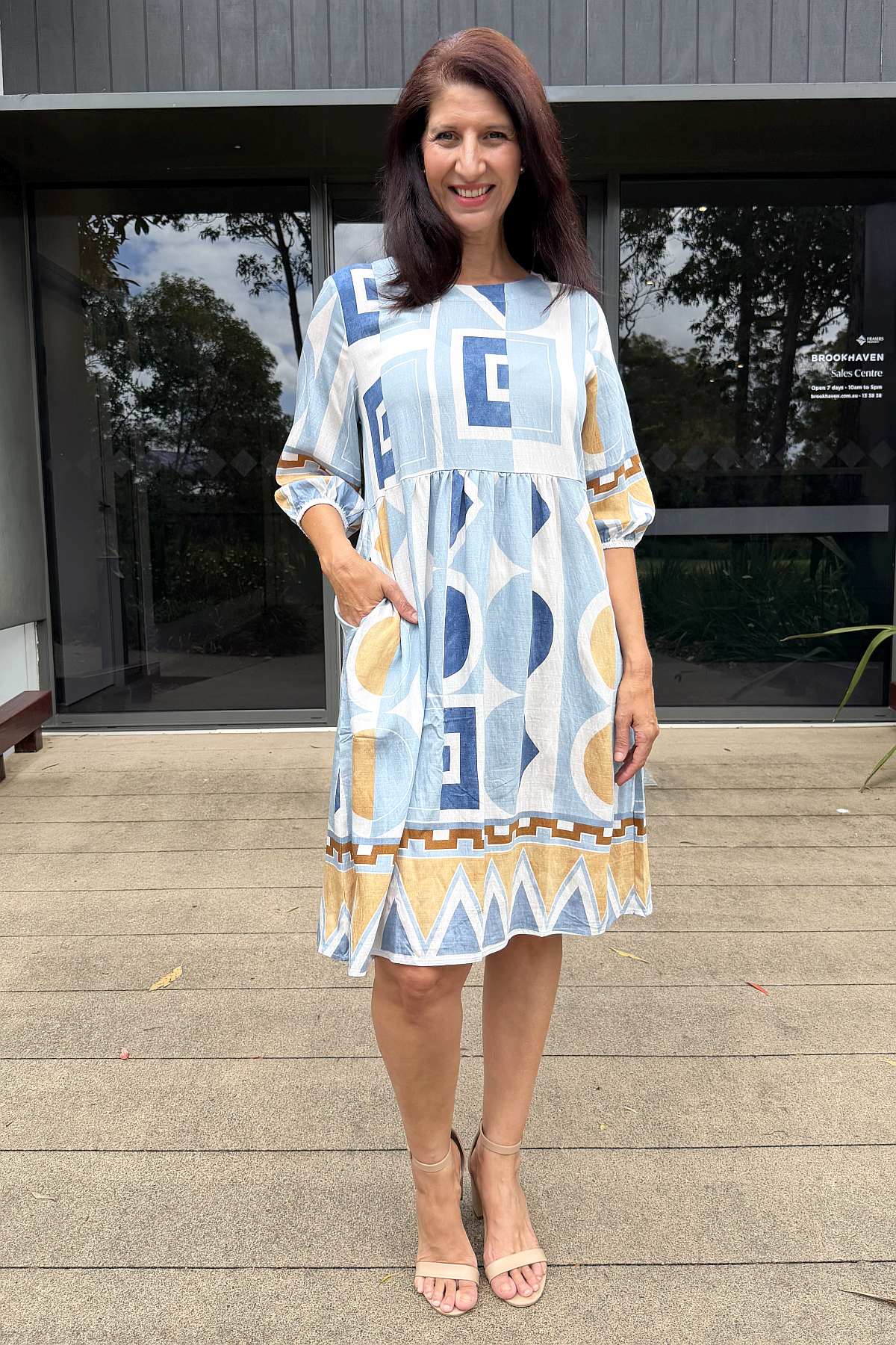 Regular price $69.99This refined tunic dress combines timeless style with everyday practicality. The premium cotton-rayon blend—65% cotton and 35% rayon—delivers a soft, luxurious drape without stretch, creating an effortlessly elegant silhouette. Bold geometric patterns in blue and beige pop against the crisp white background, with each piece featuring a unique print variation. The flattering A-line cut extends below the knee, while elbow-length sleeves with elasticated cuffs ensure comfort and ease of movement. A classic scoop neckline and subtle back button detail add refined touches, and functional side pockets provide practical appeal. A versatile wardrobe staple for the discerning wearer.
