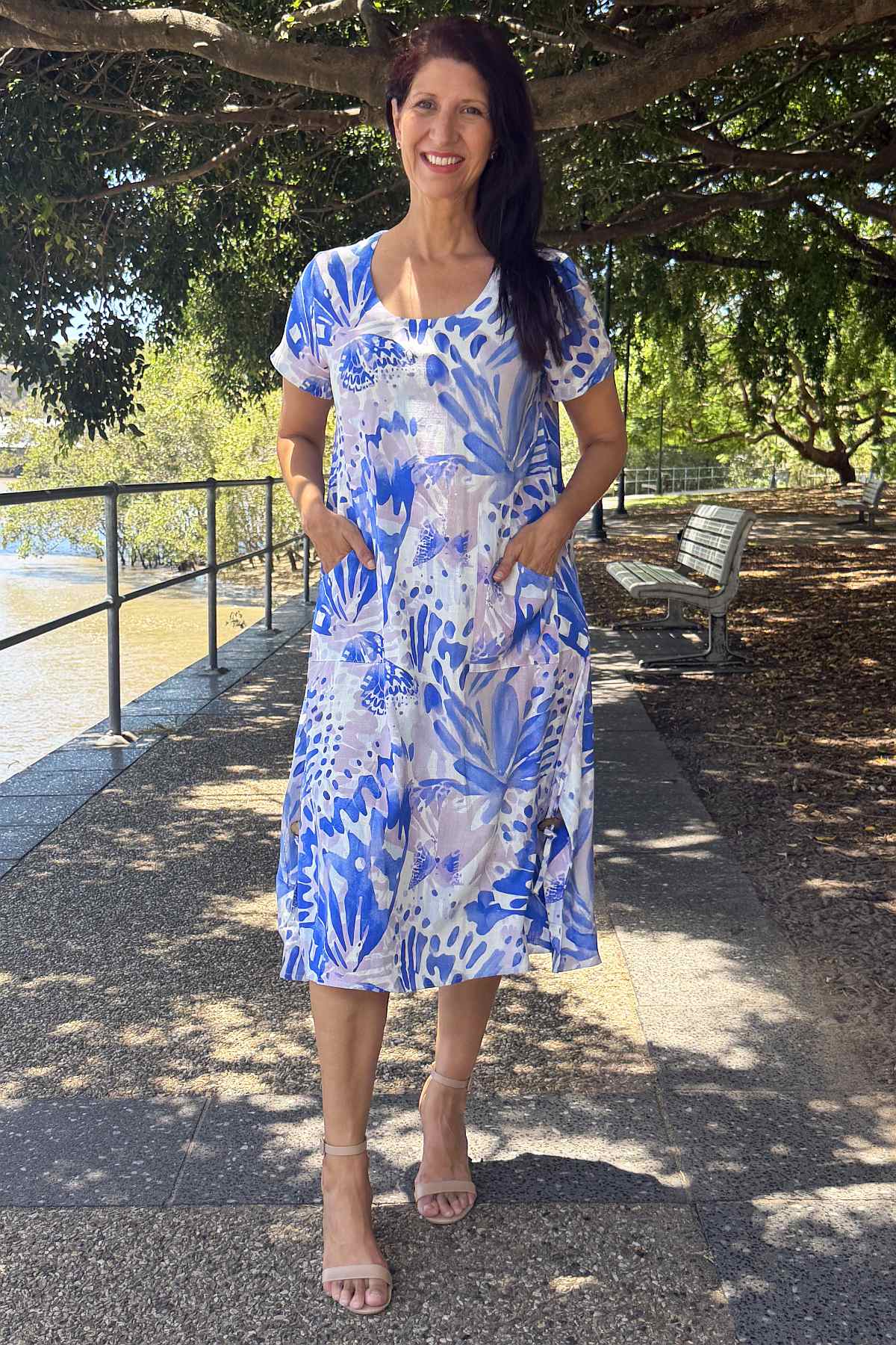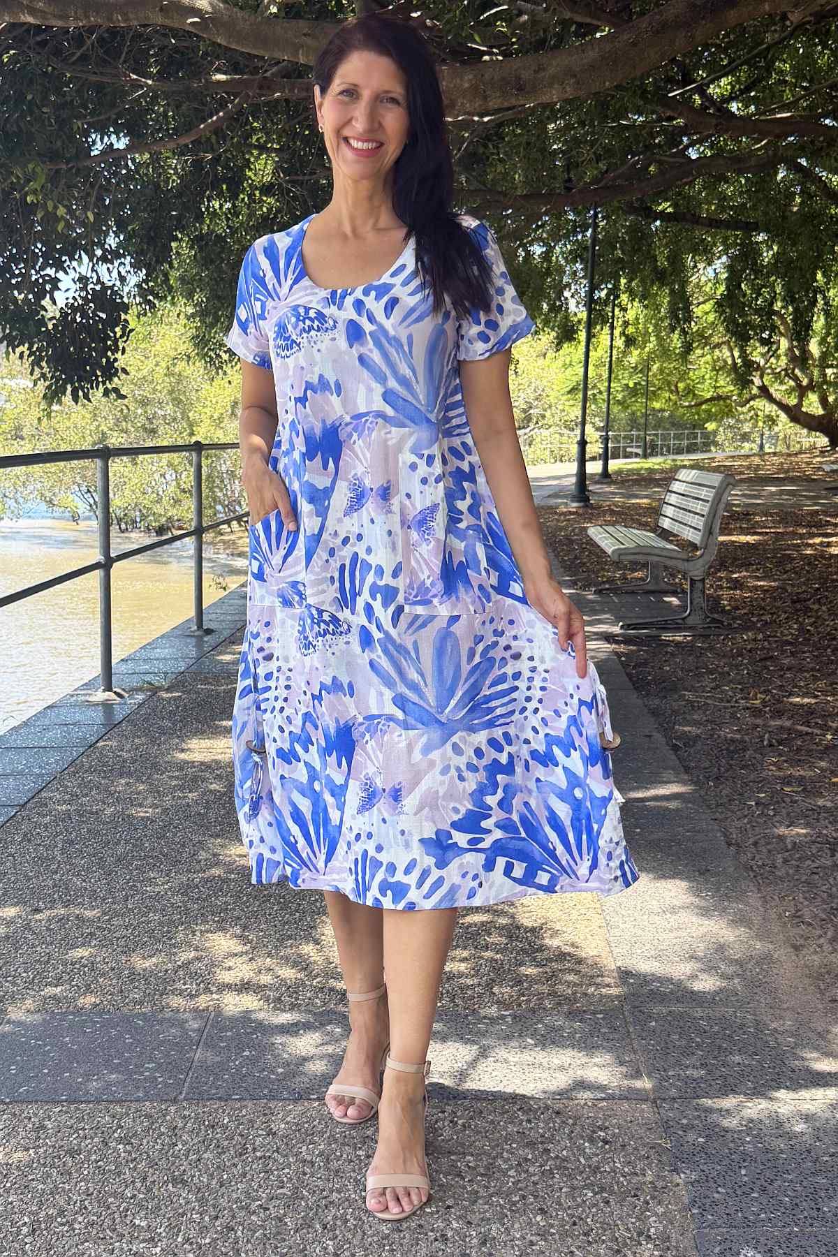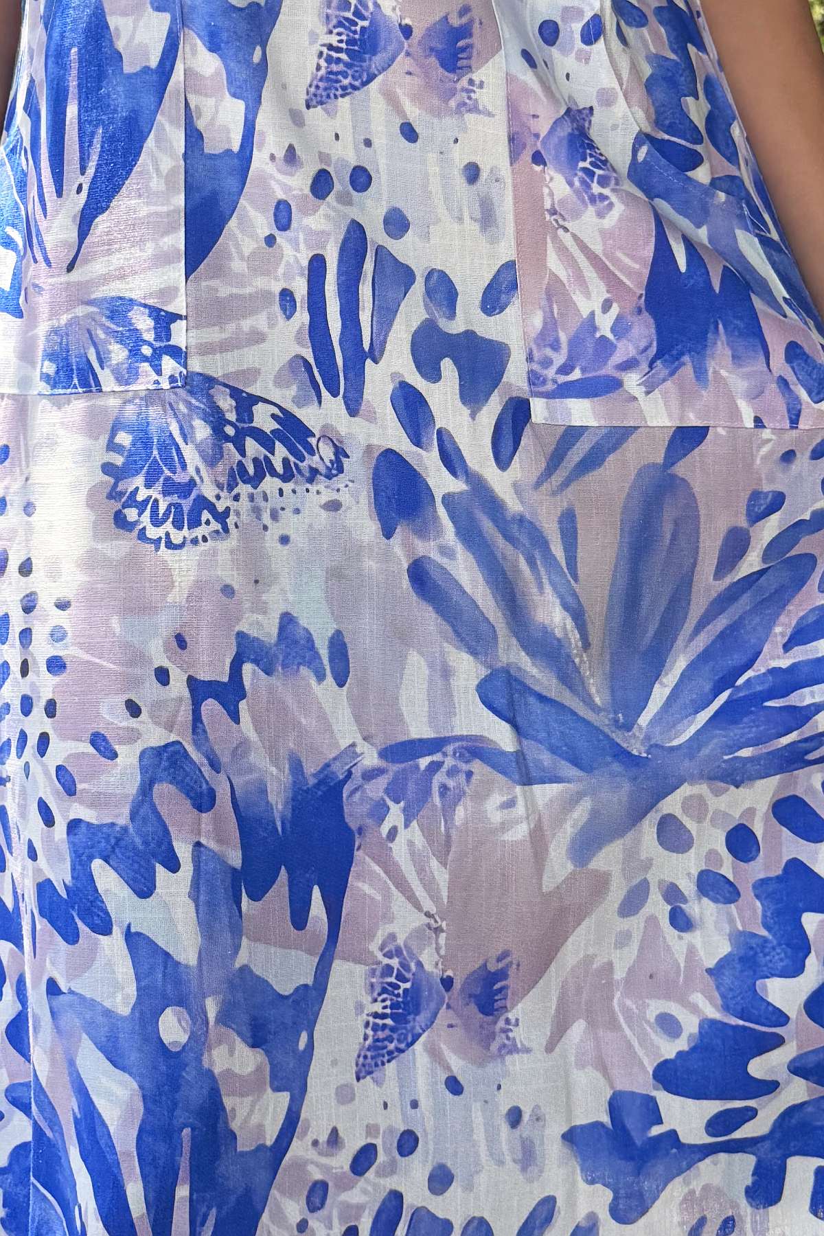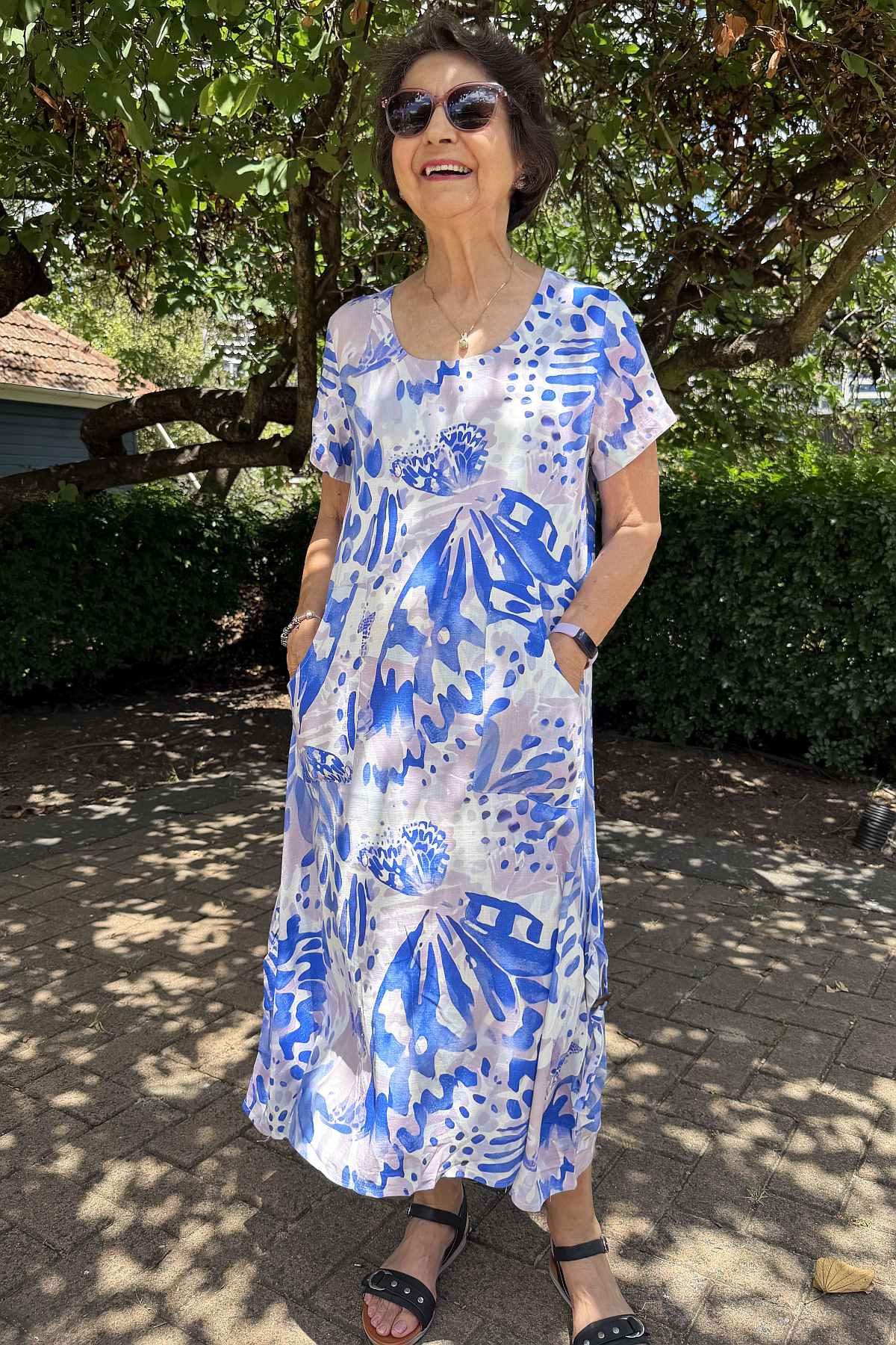 Elevate your everyday wardrobe with this sophisticated tunic dress, featuring a striking floral design of blue petals and soft mauve accents against a crisp white backdrop. Crafted from a luxurious linen-cotton blend, this piece offers a premium feel with natural breathability. The flattering A-line silhouette skims the body gracefully, falling below the knee for refined elegance. Short sleeves and a classic V-neckline provide timeless appeal, while functional side pockets add practical charm. Finished with delicate coconut button detailing on the side, each dress showcases a unique print variation, making it a distinctive addition to your collection.