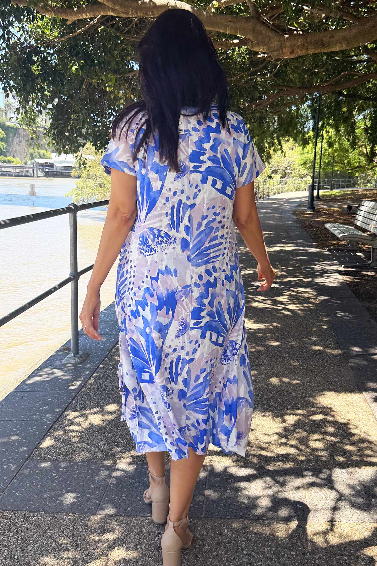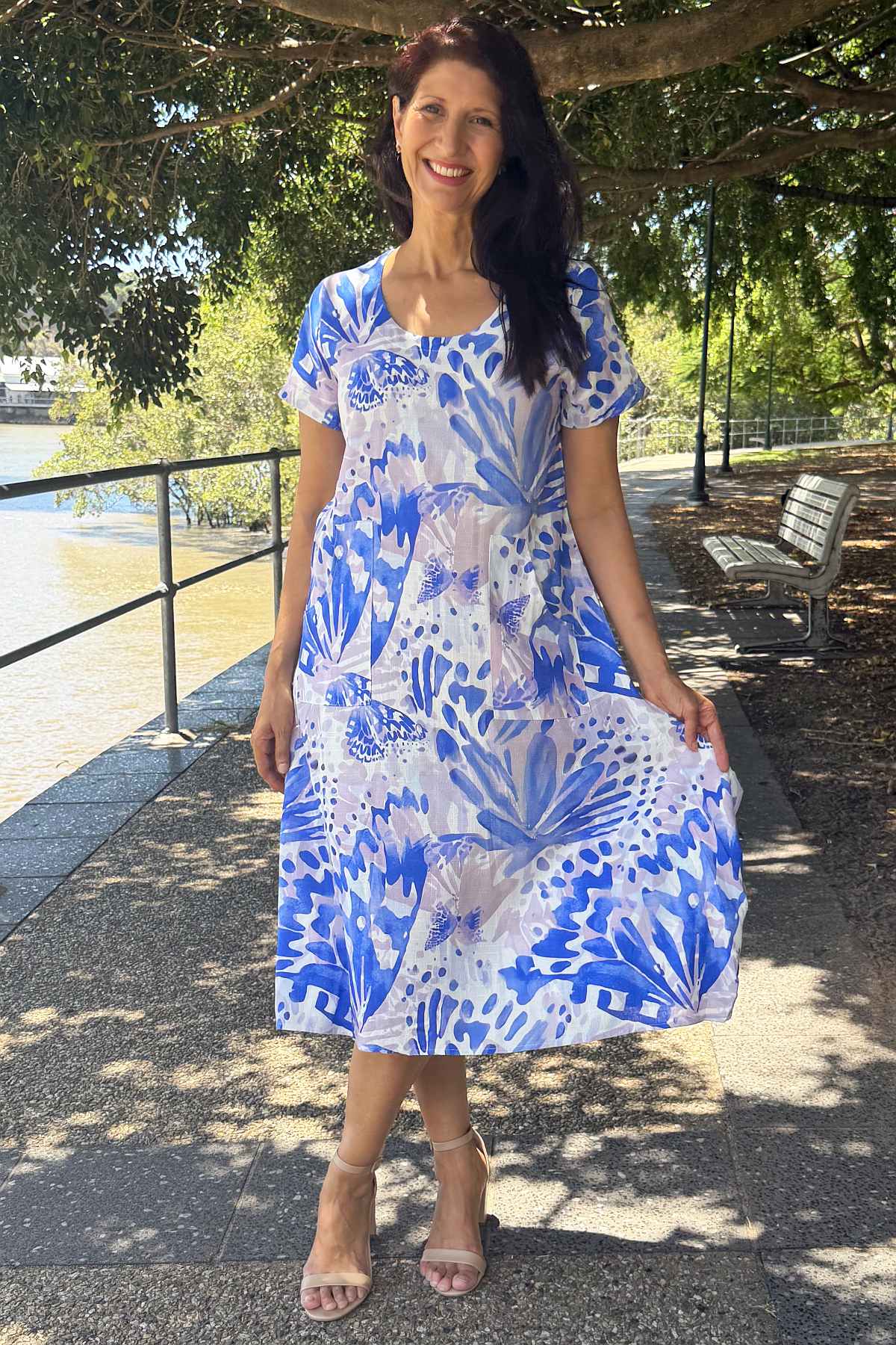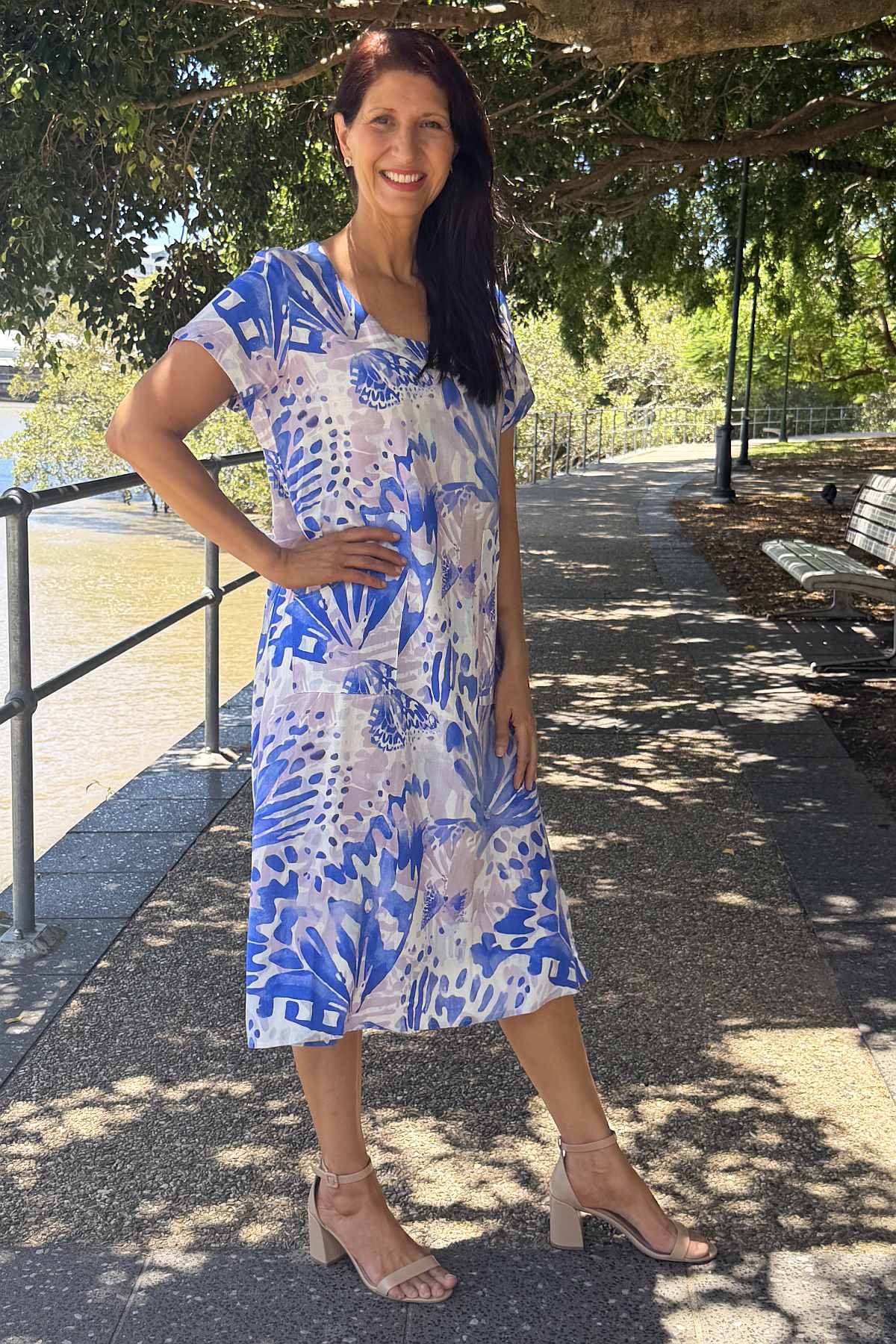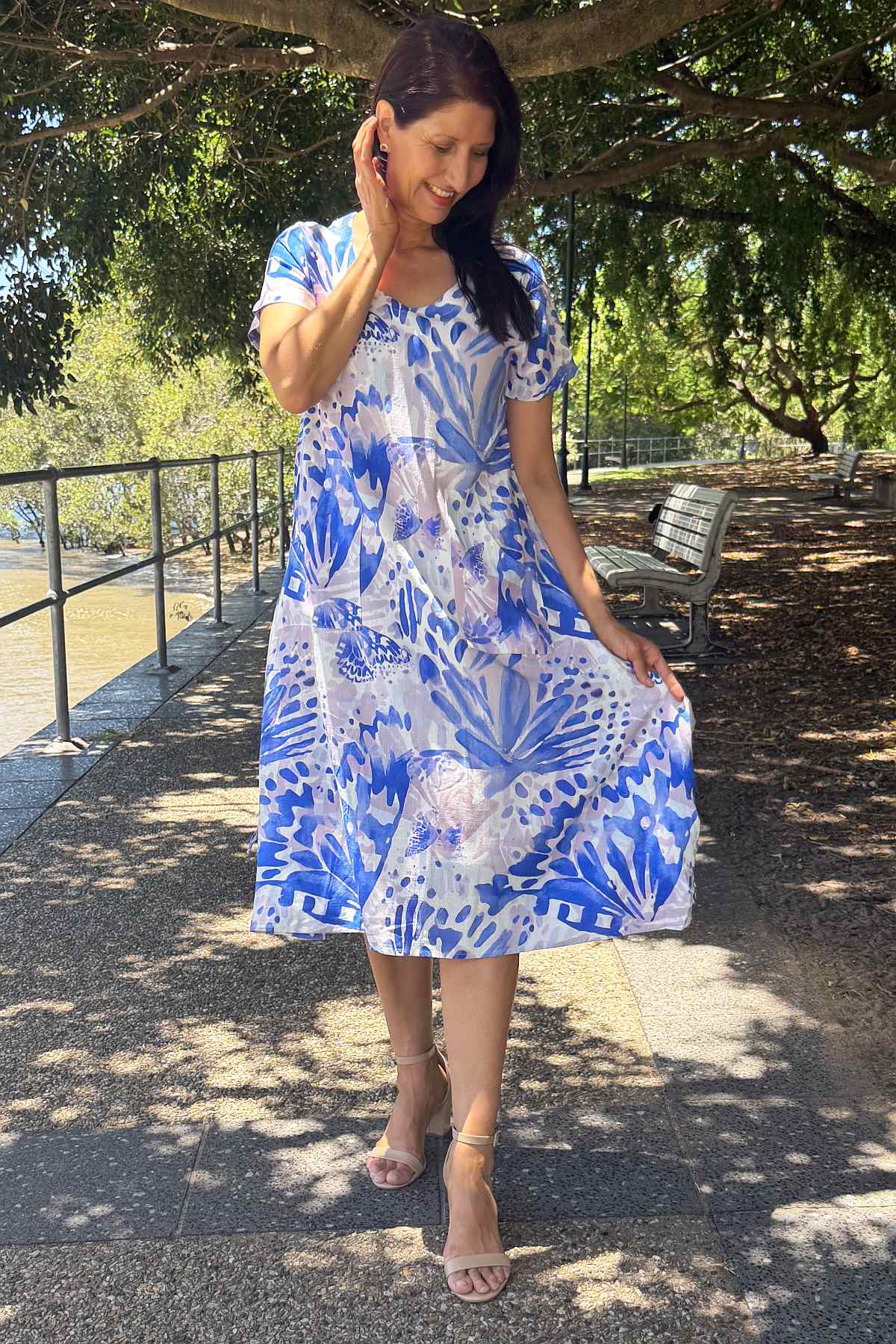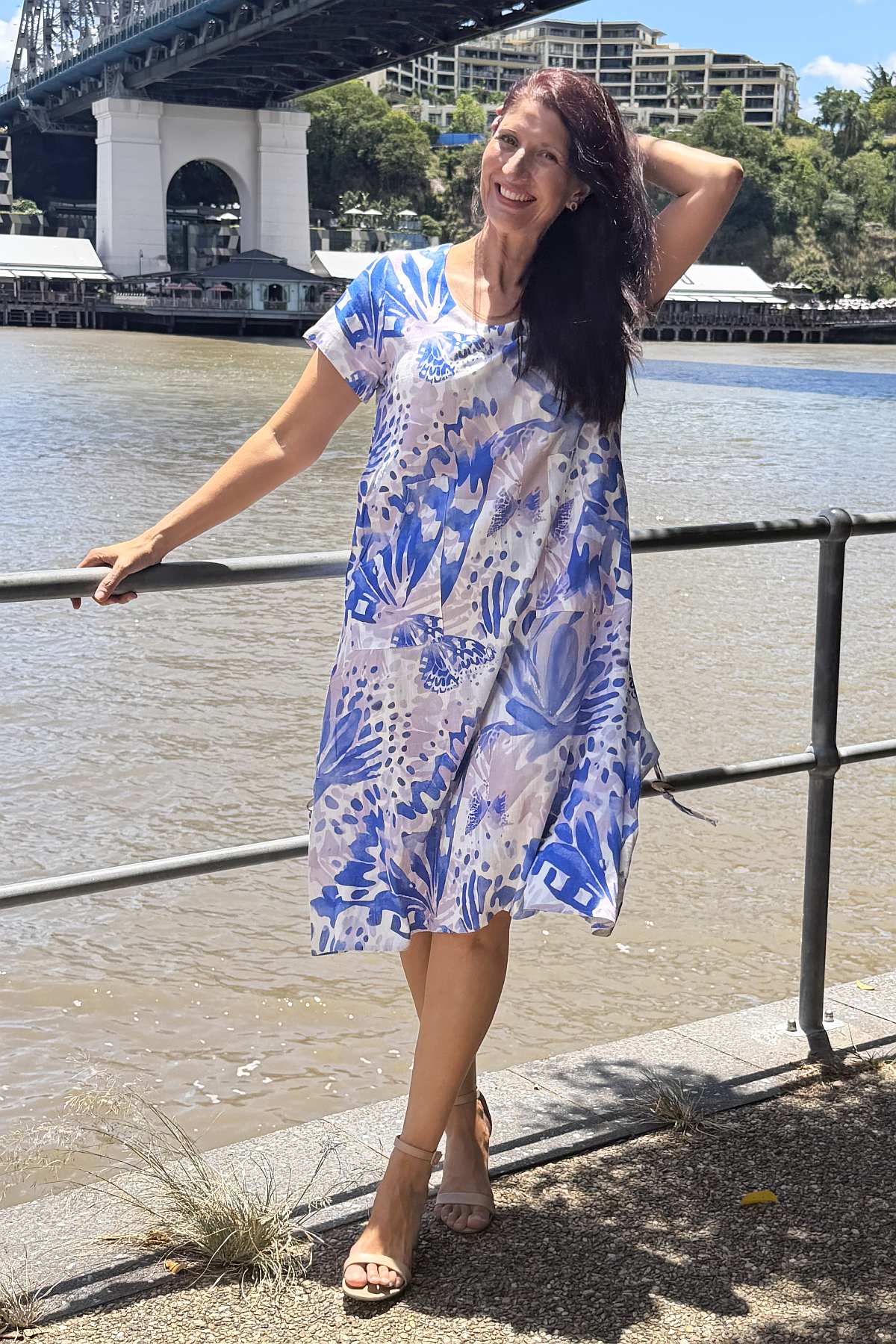Blue Petals Short Sleeve Tunic Dress. This garment is sized / resized according to our detailed sizing guide. Please refer to the guide to choose the most flattering fit for your body shape and comfort.