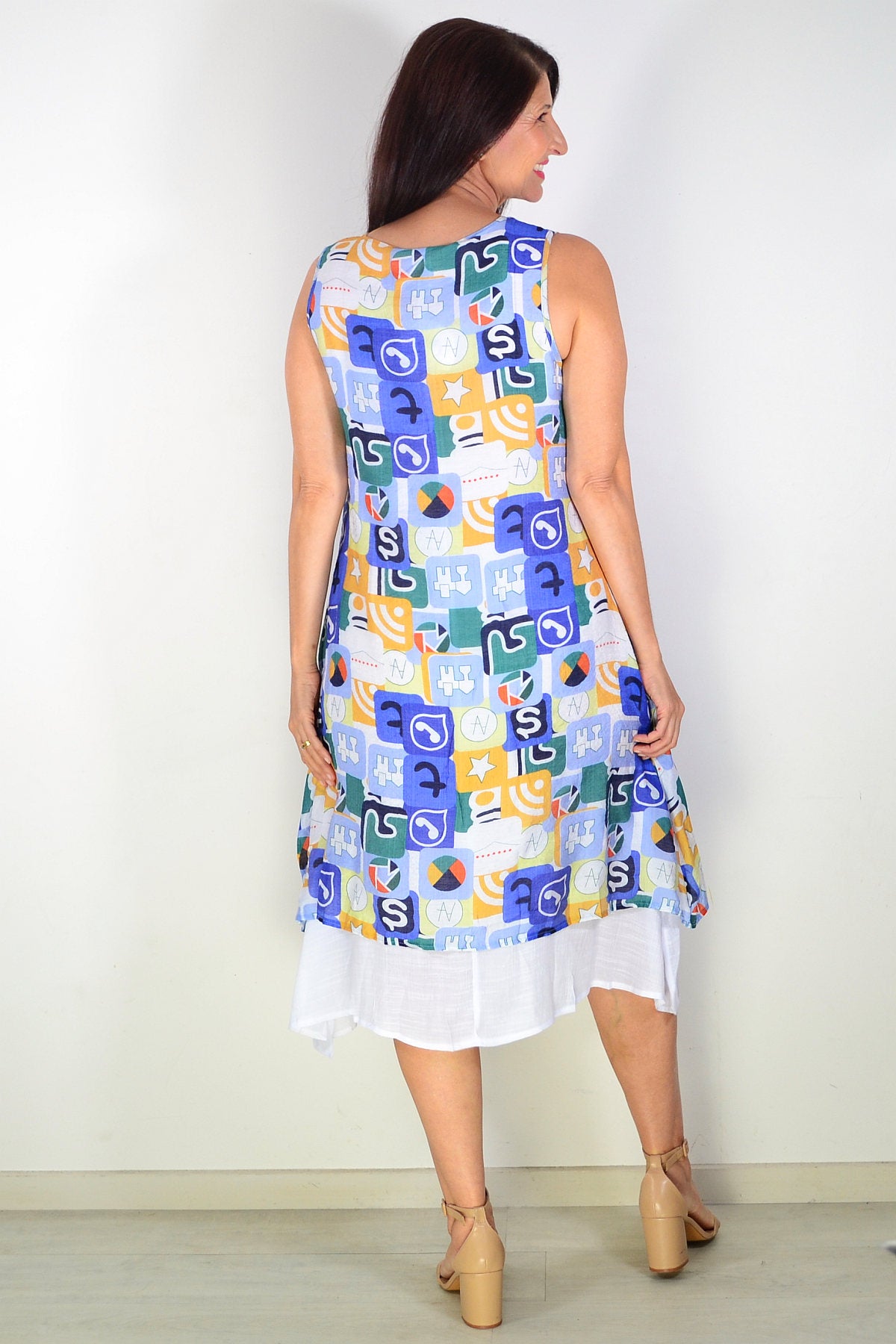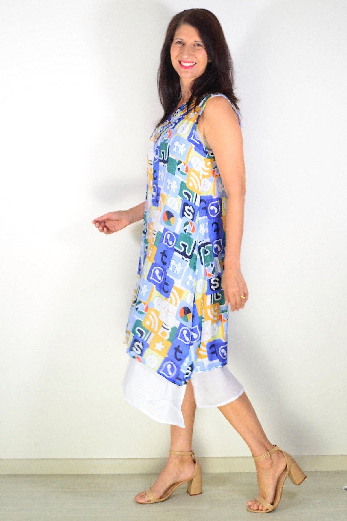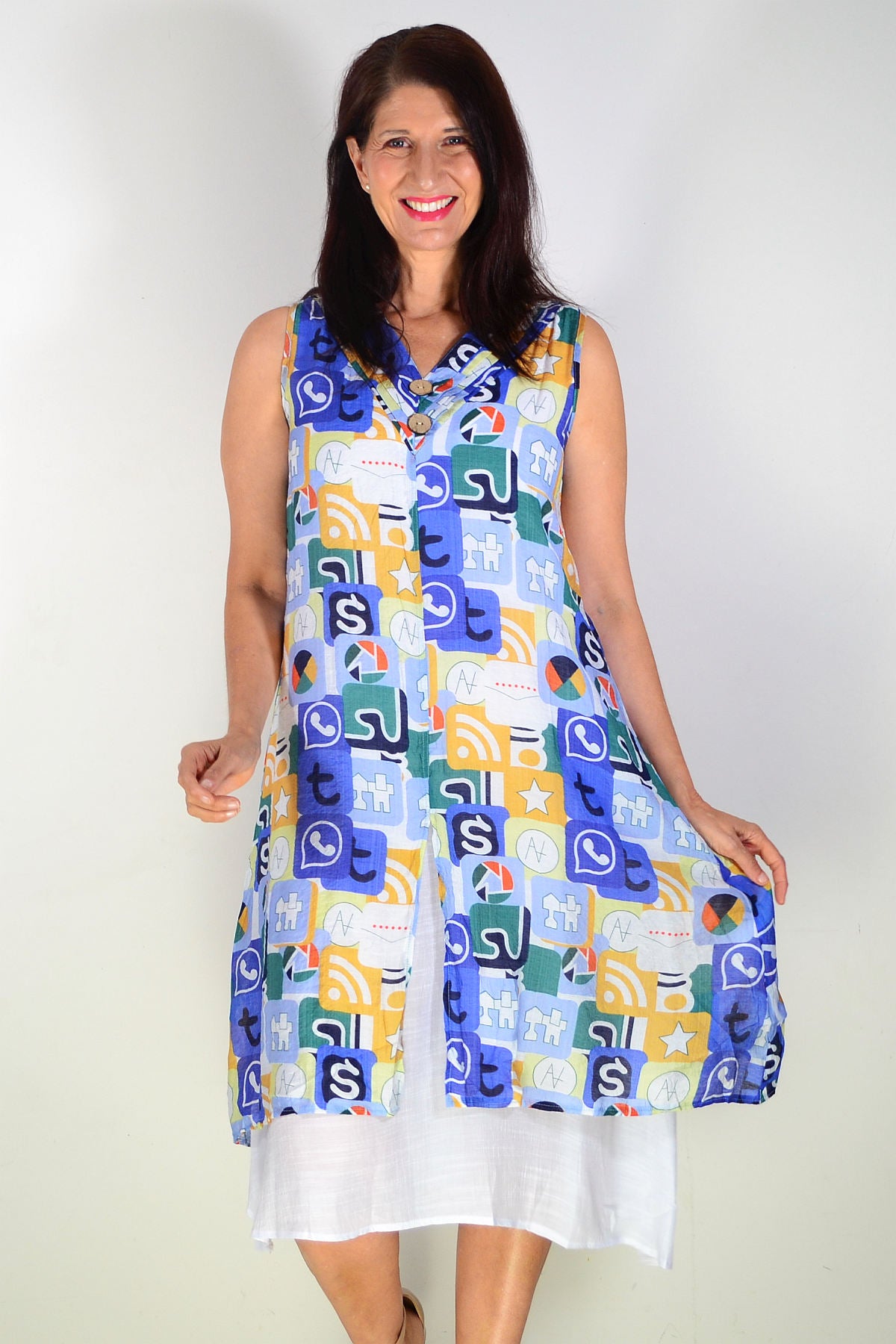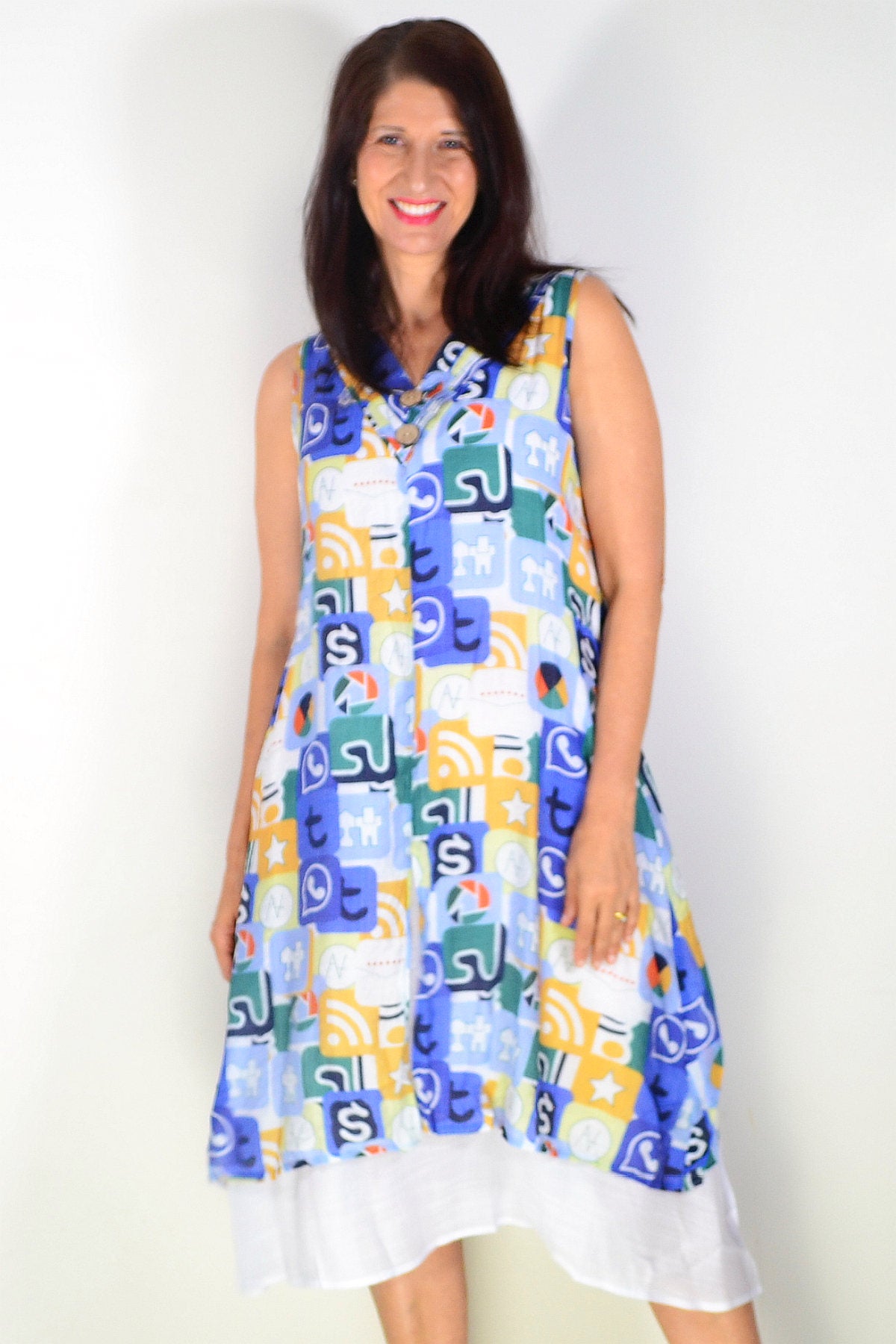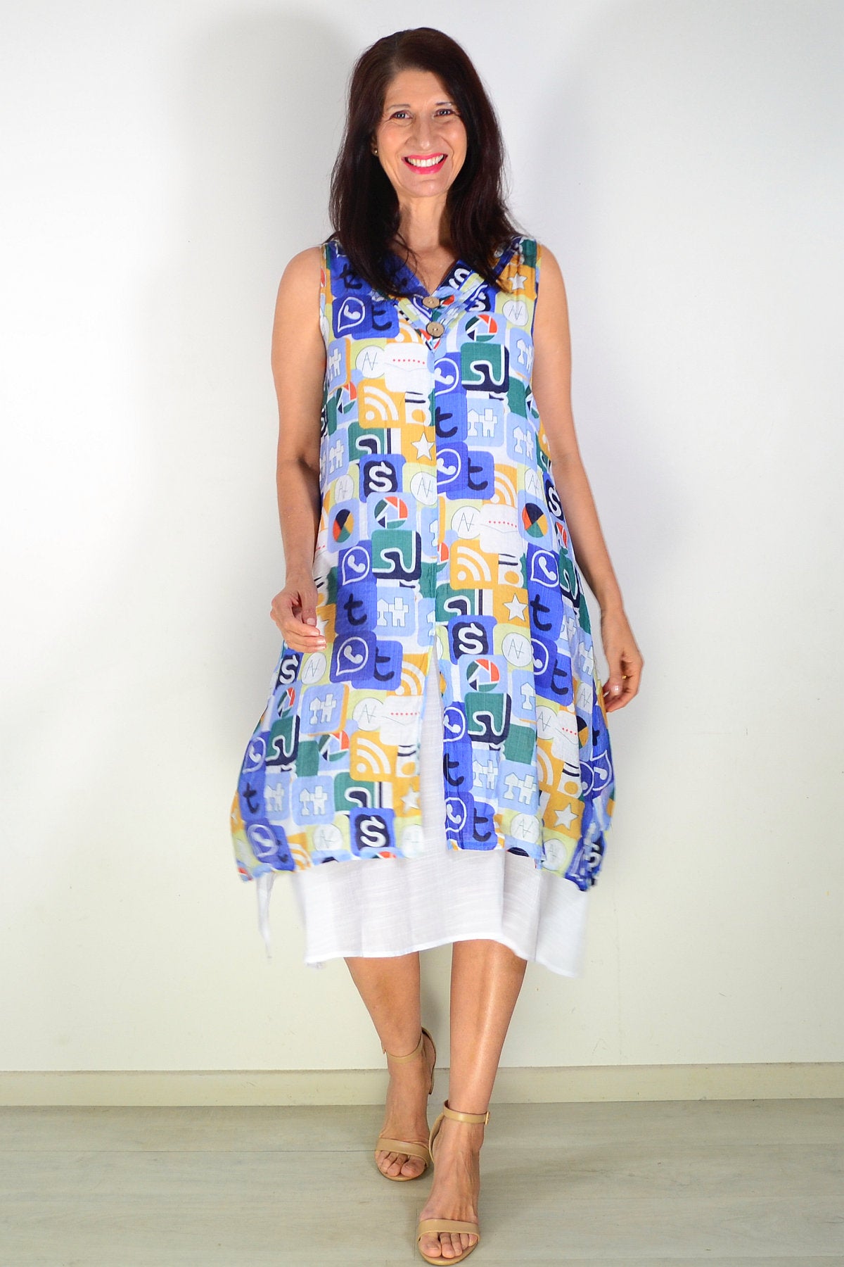 Regular price $59.99Embrace effortless summer style with this stunning sleeveless tunic dress. Featuring a vibrant blue base adorned with mustard and green print, it's designed for relaxed, all-day comfort. The breathable cotton-blend fabric (65% cotton, 35% polyester) is beautifully opaque and won't cling. Details include a flattering V-neckline with button accents, coconut buttons, an uneven layered hem, and a white petticoat underneath for added dimension.