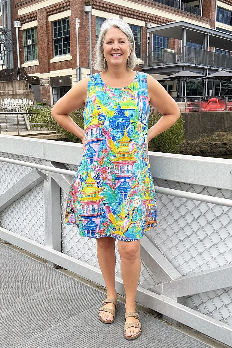 Regular price $109.00 Sale price $89.00The Okayama Reversible Shift Tunic Dress offers effortless versatility with two distinct abstract prints in one piece. One side features vibrant green and yellow hues, while the reverse showcases cool blue and white tones, giving you two complete looks from a single garment. Crafted from premium organic cotton and ethically sourced from India, this sleeveless tunic features a relaxed, flowing silhouette with a classic round neckline and practical side pockets. The knee-length cut provides understated elegance, while the reversible design ensures maximum styling flexibility for any occasion.