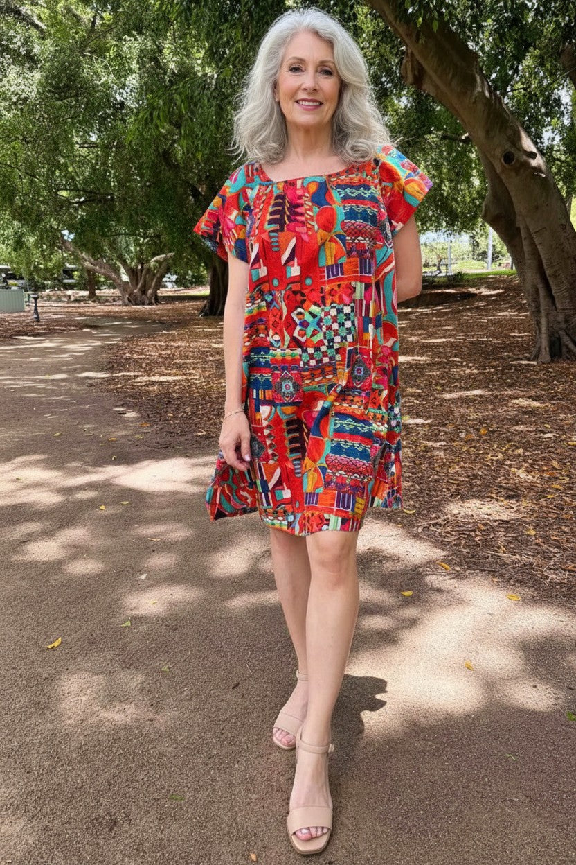 The Peru tunic dress embodies understated sophistication with its vibrant abstract print in aqua, coral, and orange hues. A refined square neckline accented with delicate pleats frames the shoulders beautifully, while the relaxed, flowing silhouette offers comfort without compromise. Designed to flatter diverse body types and suit all ages, this versatile piece features practical pockets and a graceful knee-length hem. Made from premium 100% organic cotton that's ethically sourced and produced in India, it's a conscious choice for the discerning wardrobe—equally at home at weekend gatherings or casual weekday moments.