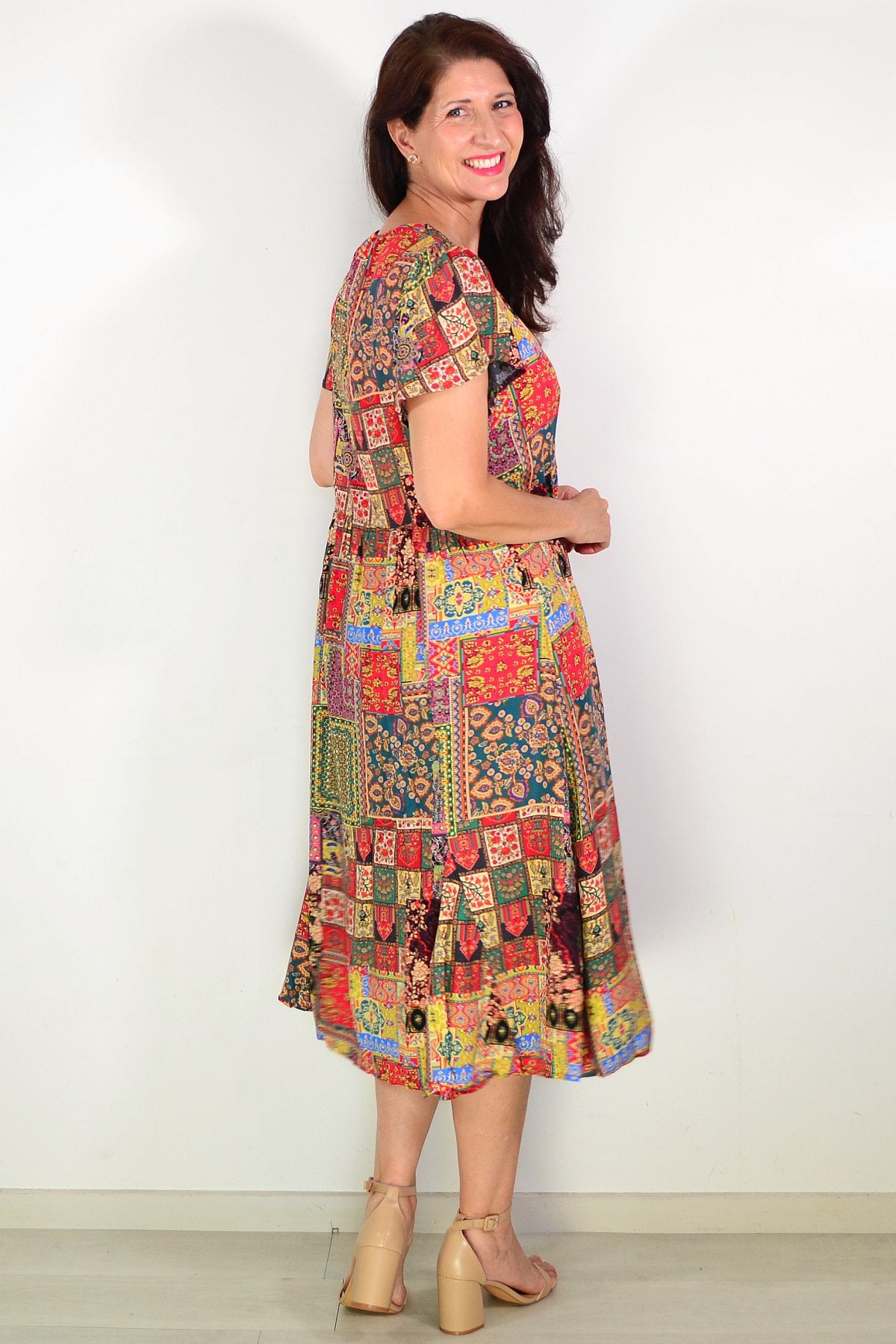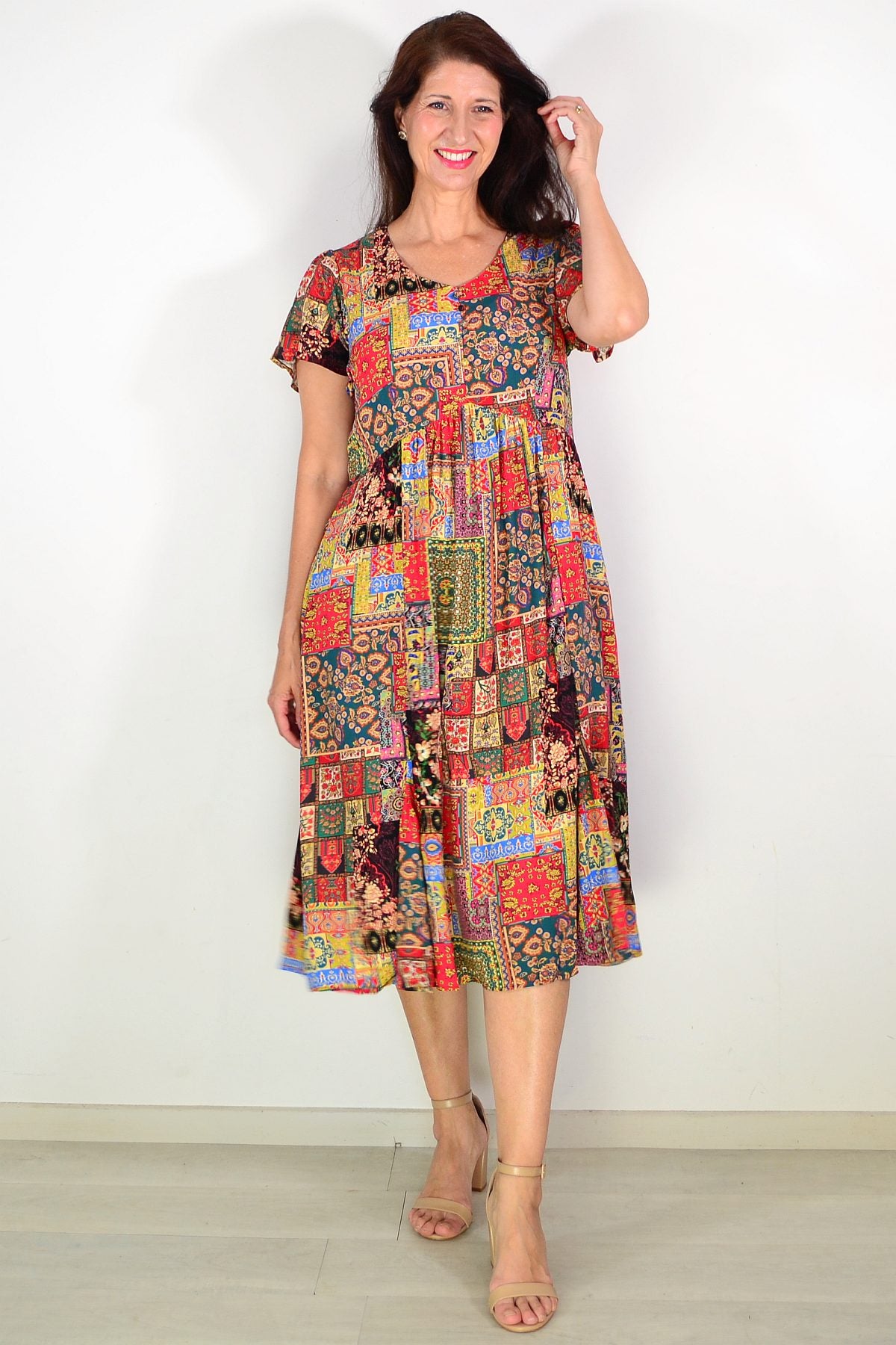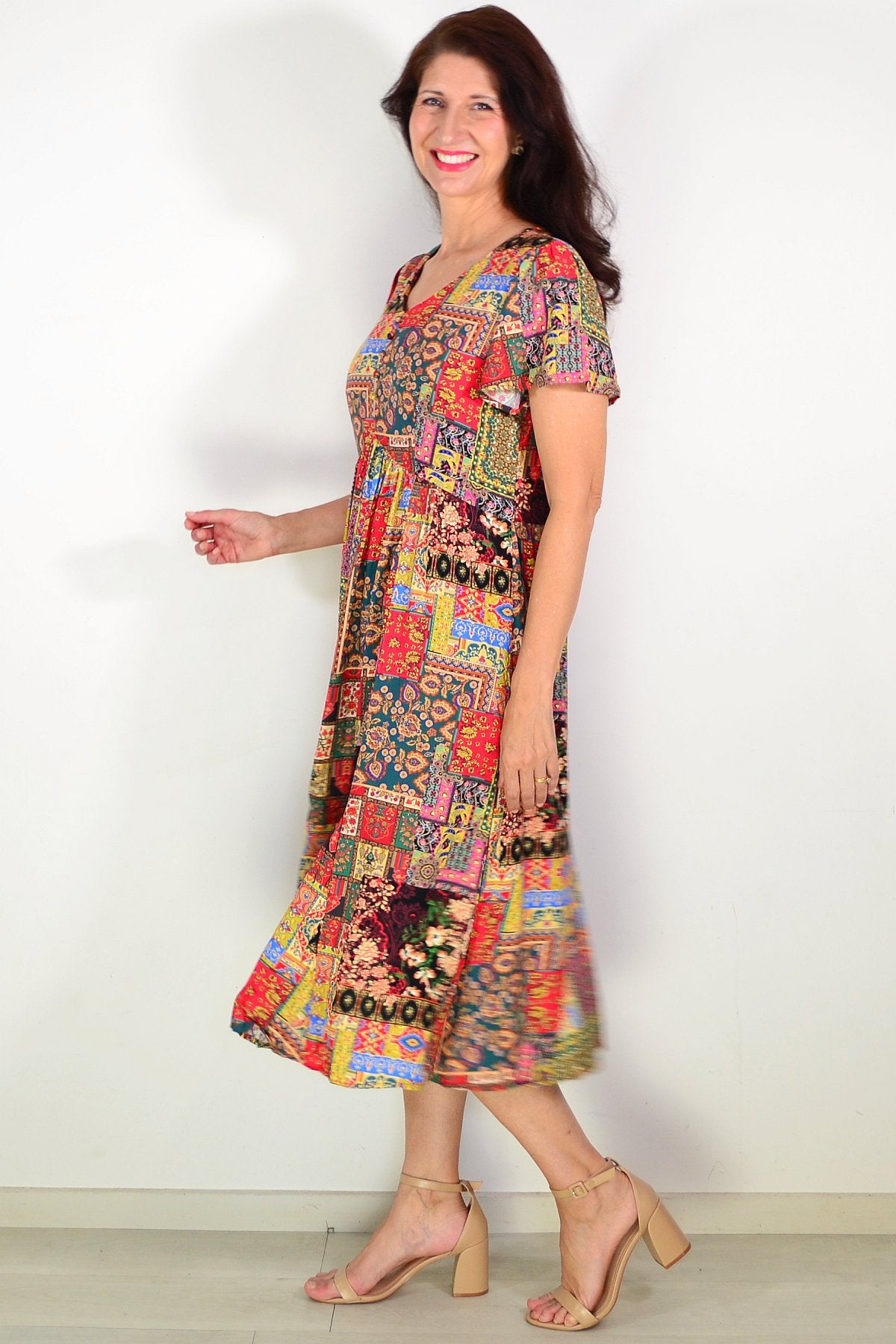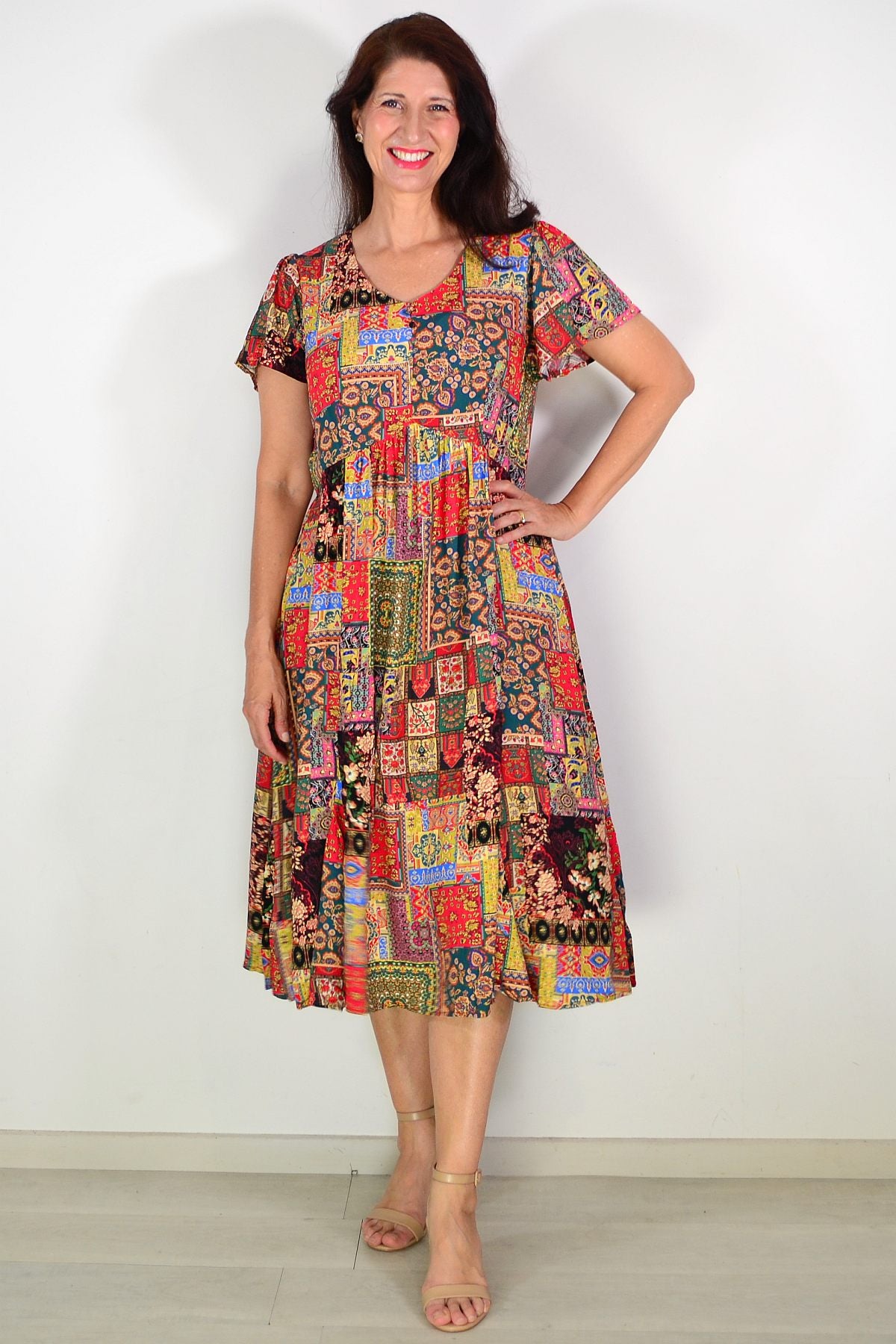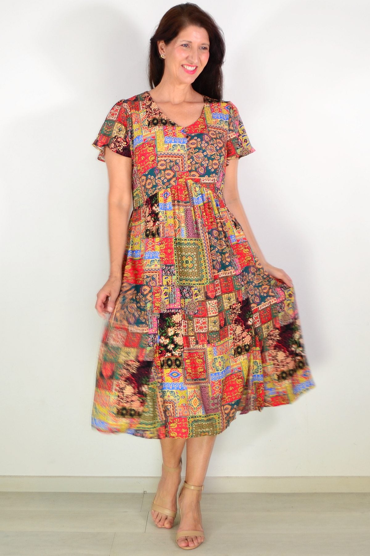 Red Geometric Pattern Midi Tunic Dress comes in size 10 to 18 - Please have a look at our sizing guide to help you selected the size that compliments you