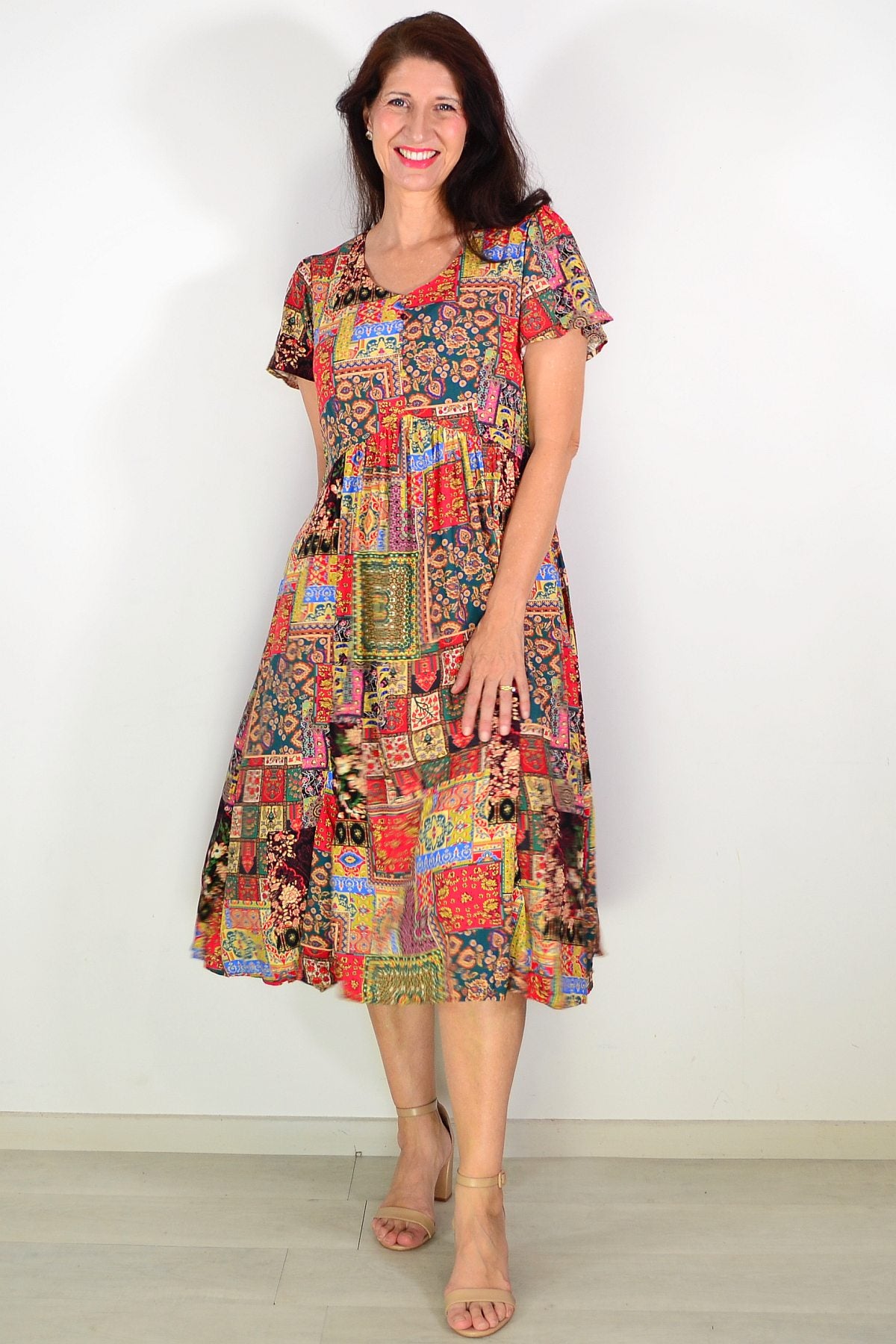 Regular price $59.00Dive into colour with this playful midi tunic dress that bursts with aqua, blue, and purple abstract patterns. Made from cool, comfortable rayon, it's designed to move with you in an easy A-line silhouette that works for any occasion. Hitting just below the knee, this cheerful piece features charming decorative buttons at the front. Perfect for adding a splash of artistic joy to your everyday style.