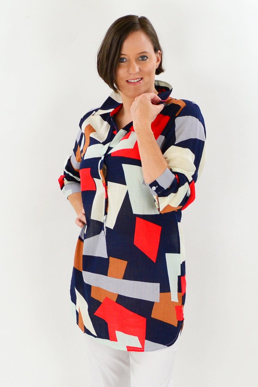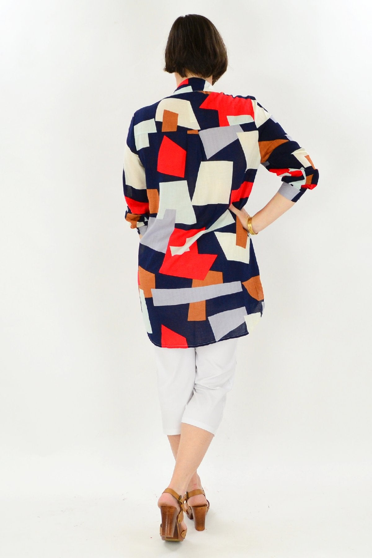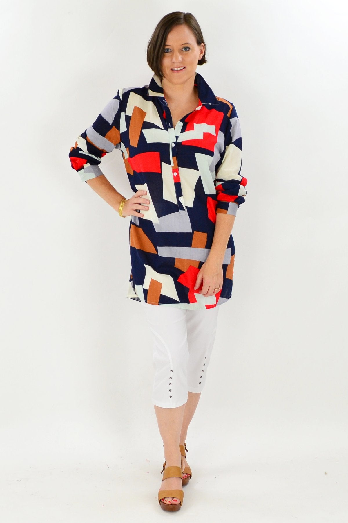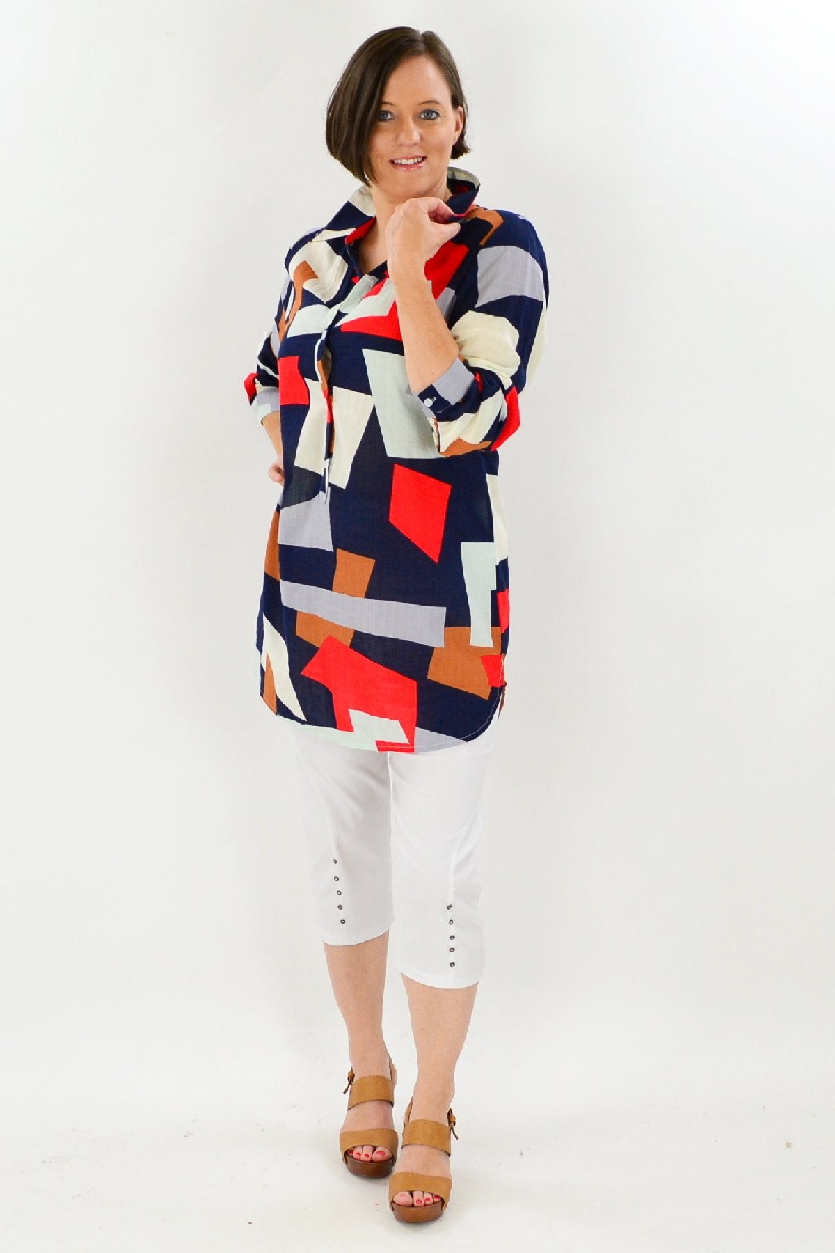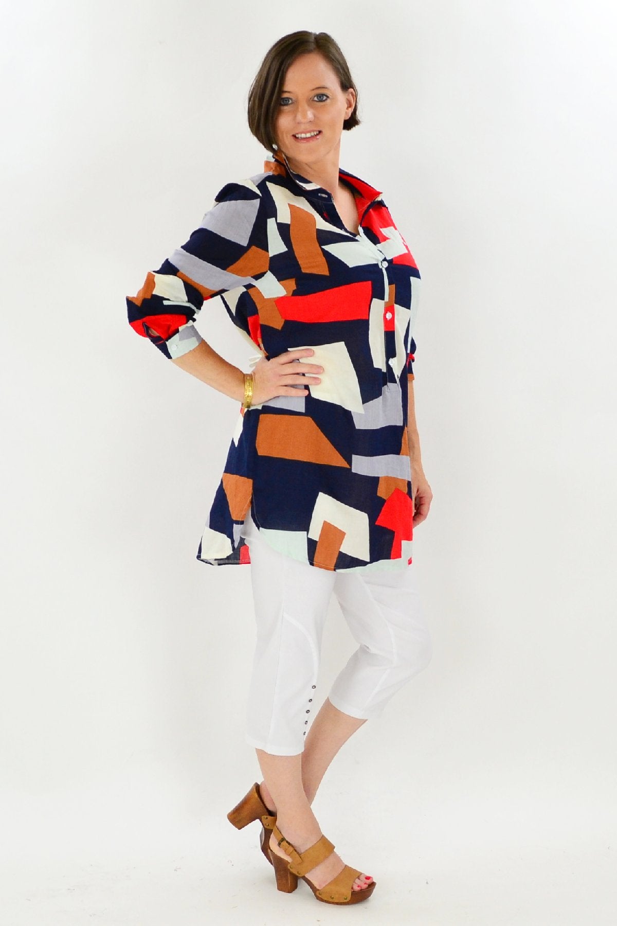 This cool and casual shirt is in a cotton fabric that is lightweight and easy to wear.  It features 3/4 sleeves with a button up cuffs, side slits, buttons though to waist with a back tuck and a classic shirt collar. Wear this in a variety of ways, paired with leggings and a sun hat or as a beach cover up