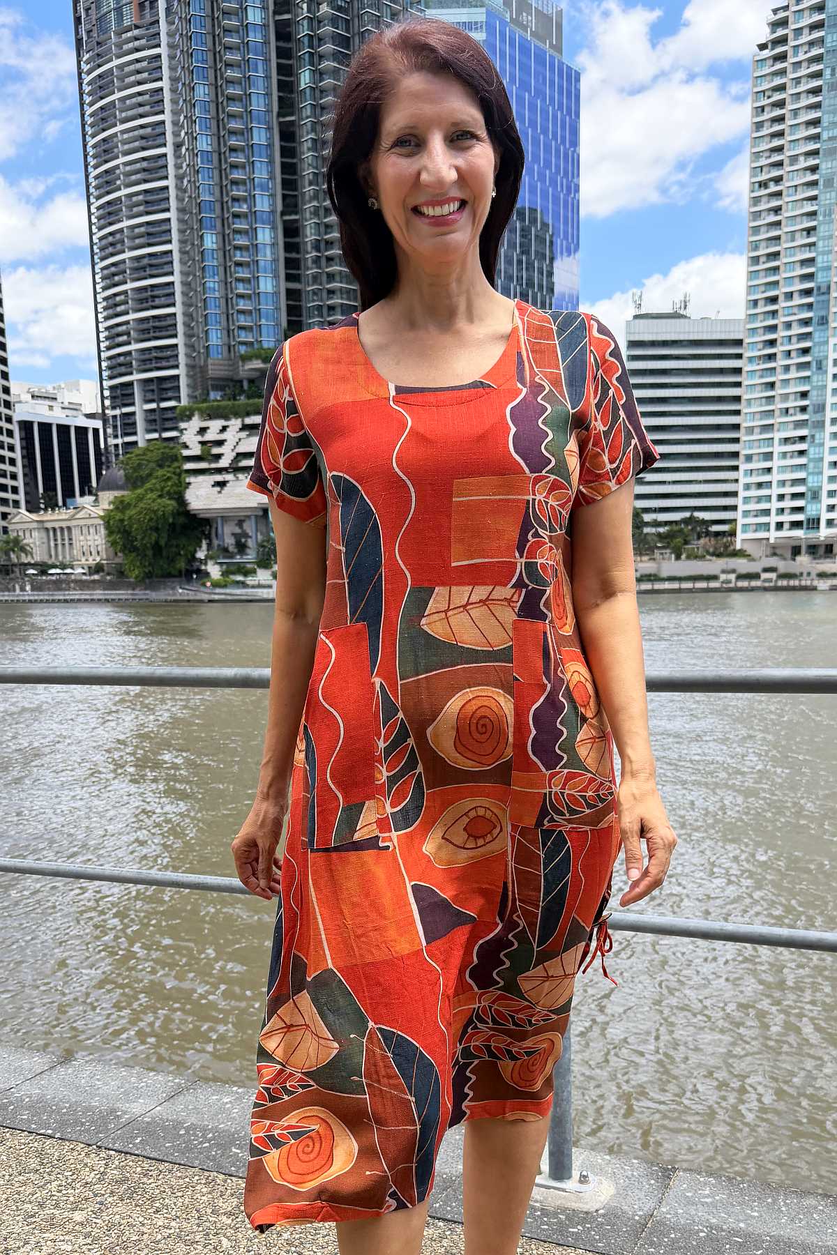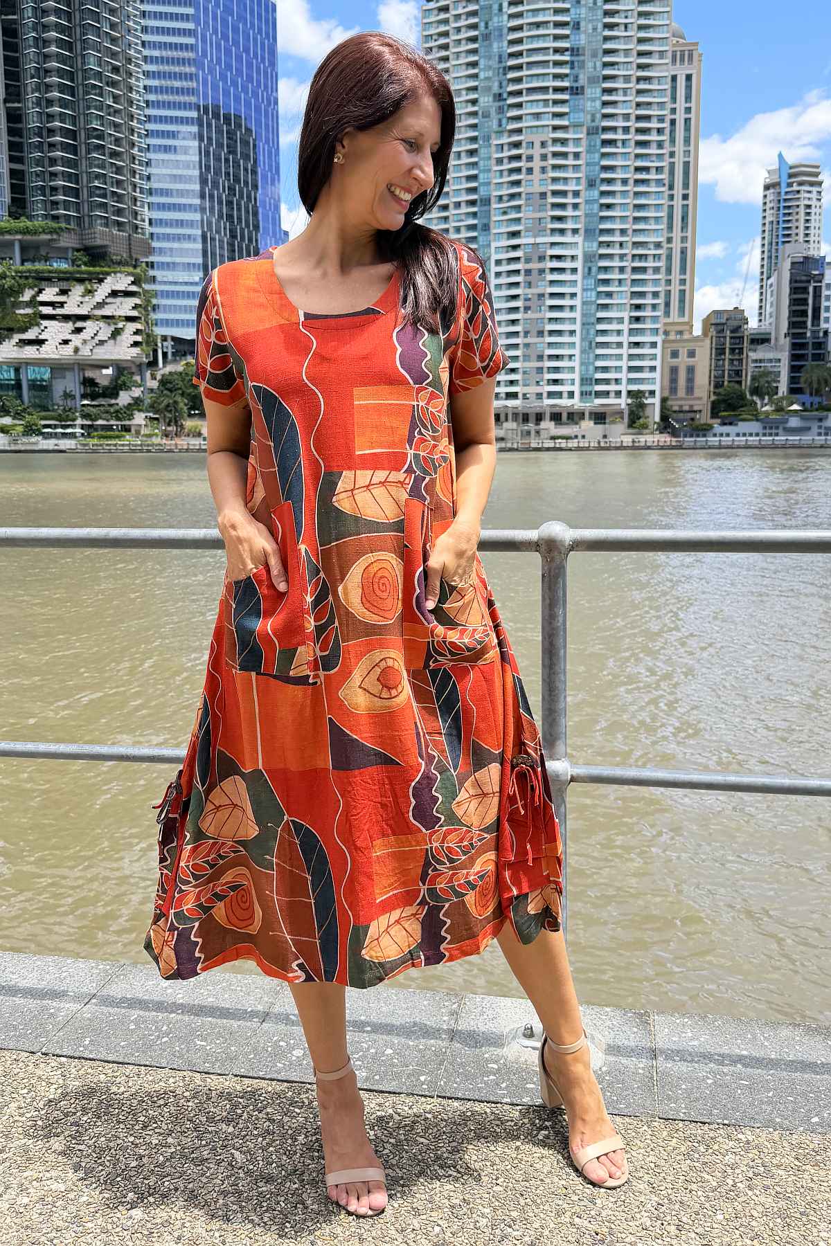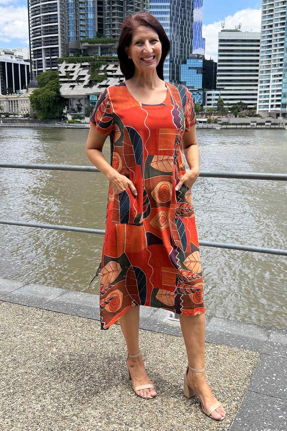 Regular price $69.99This striking tunic dress combines timeless elegance with everyday practicality. Crafted from a luxurious linen-cotton blend, the fabric offers a soft, breathable drape that moves beautifully without clinging. The vibrant abstract pattern showcases warm orange and red tones against a mixed colour background, creating visual interest that complements any complexion. Designed with a flattering A-line silhouette that skims the body and extends below the knee, it features a refined V-neckline, short sleeves, and functional side pockets for convenience. Finished with a distinctive coconut button detail on the side, this piece effortlessly transitions from casual outings to relaxed social gatherings.