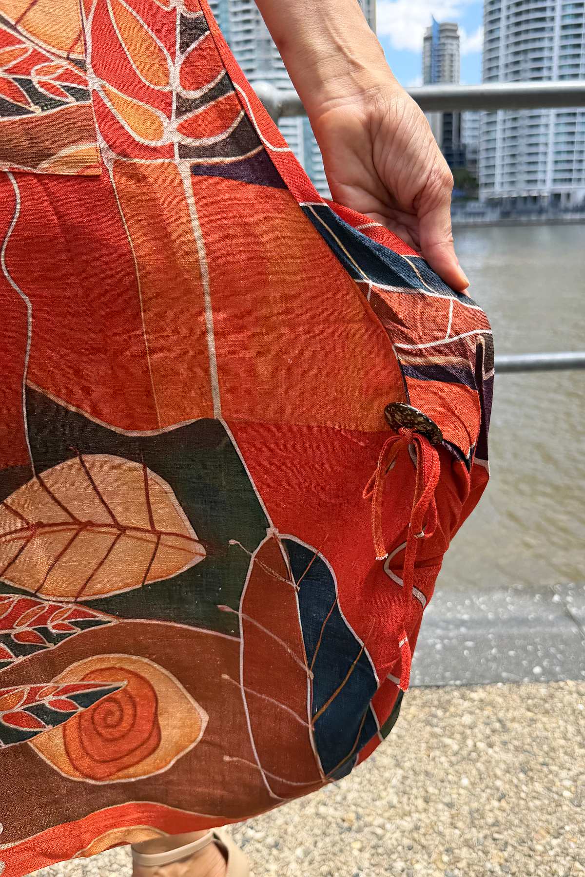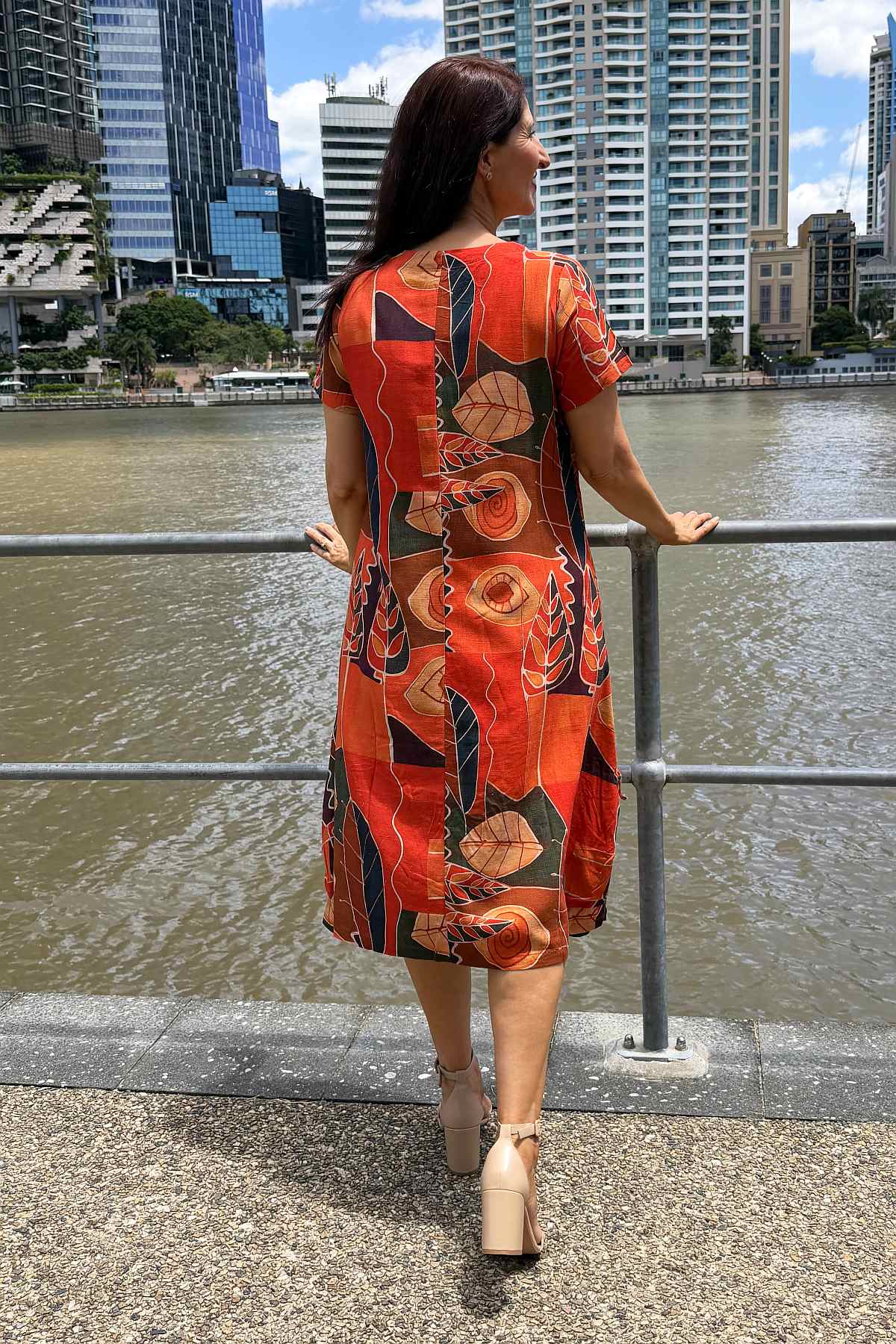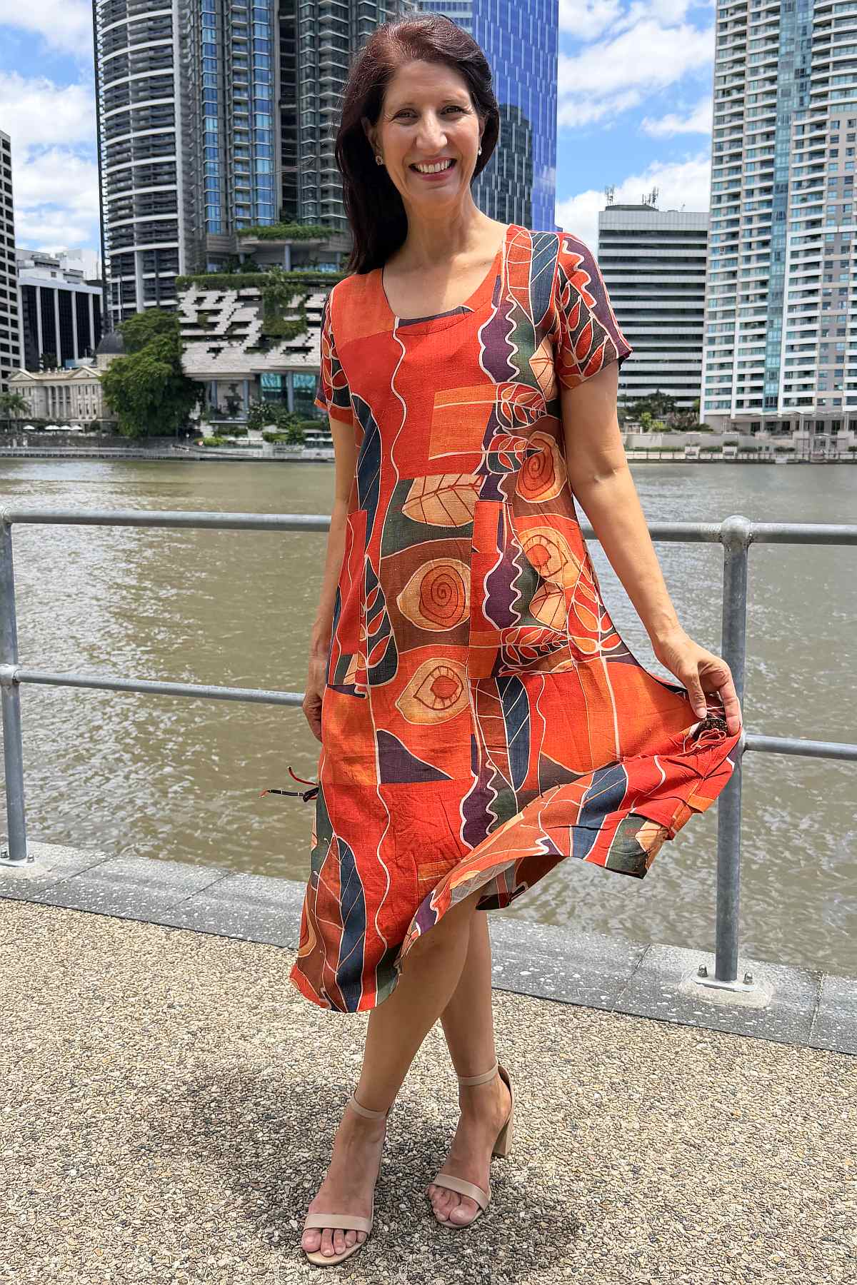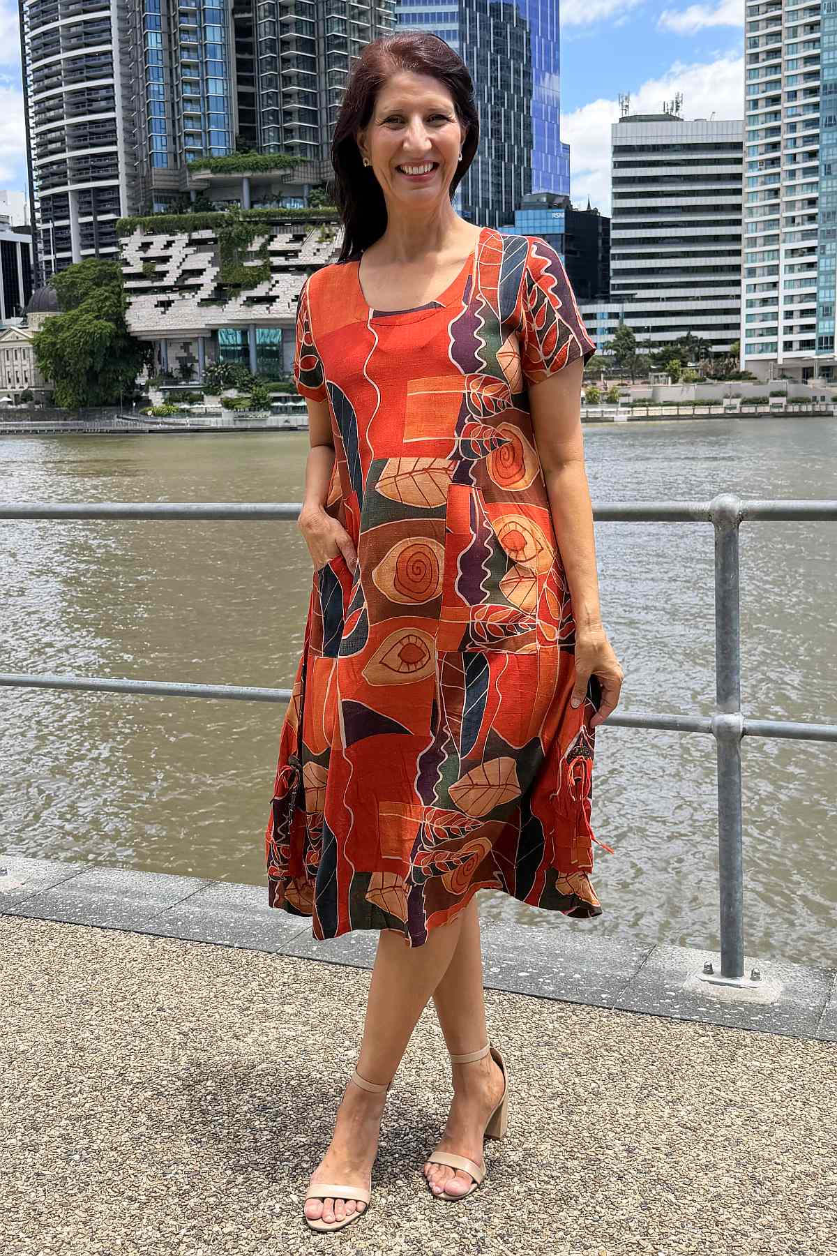 Regular price $69.99This striking tunic dress combines timeless elegance with everyday practicality. Crafted from a luxurious linen-cotton blend, the fabric offers a soft, breathable drape that moves beautifully without clinging. The vibrant abstract pattern showcases warm orange and red tones against a mixed colour background, creating visual interest that complements any complexion. Designed with a flattering A-line silhouette that skims the body and extends below the knee, it features a refined V-neckline, short sleeves, and functional side pockets for convenience. Finished with a distinctive coconut button detail on the side, this piece effortlessly transitions from casual outings to relaxed social gatherings.