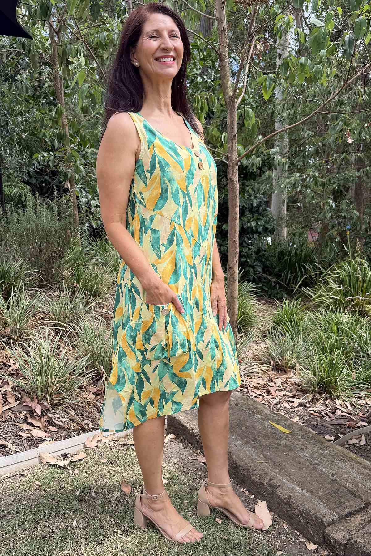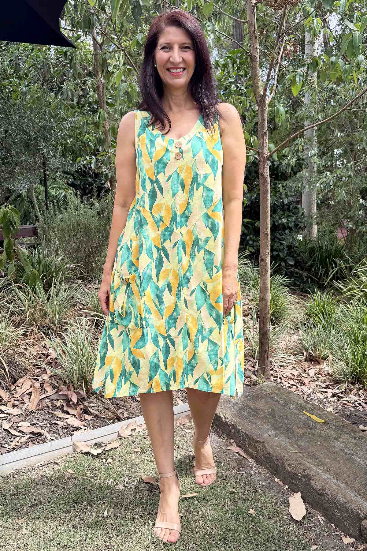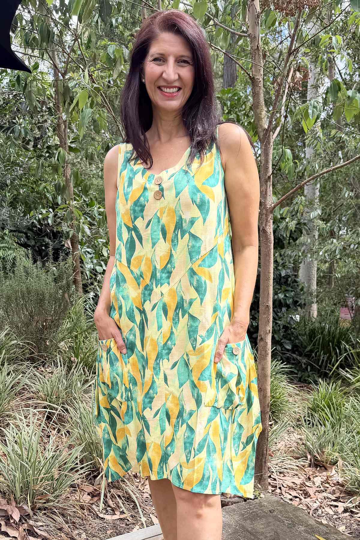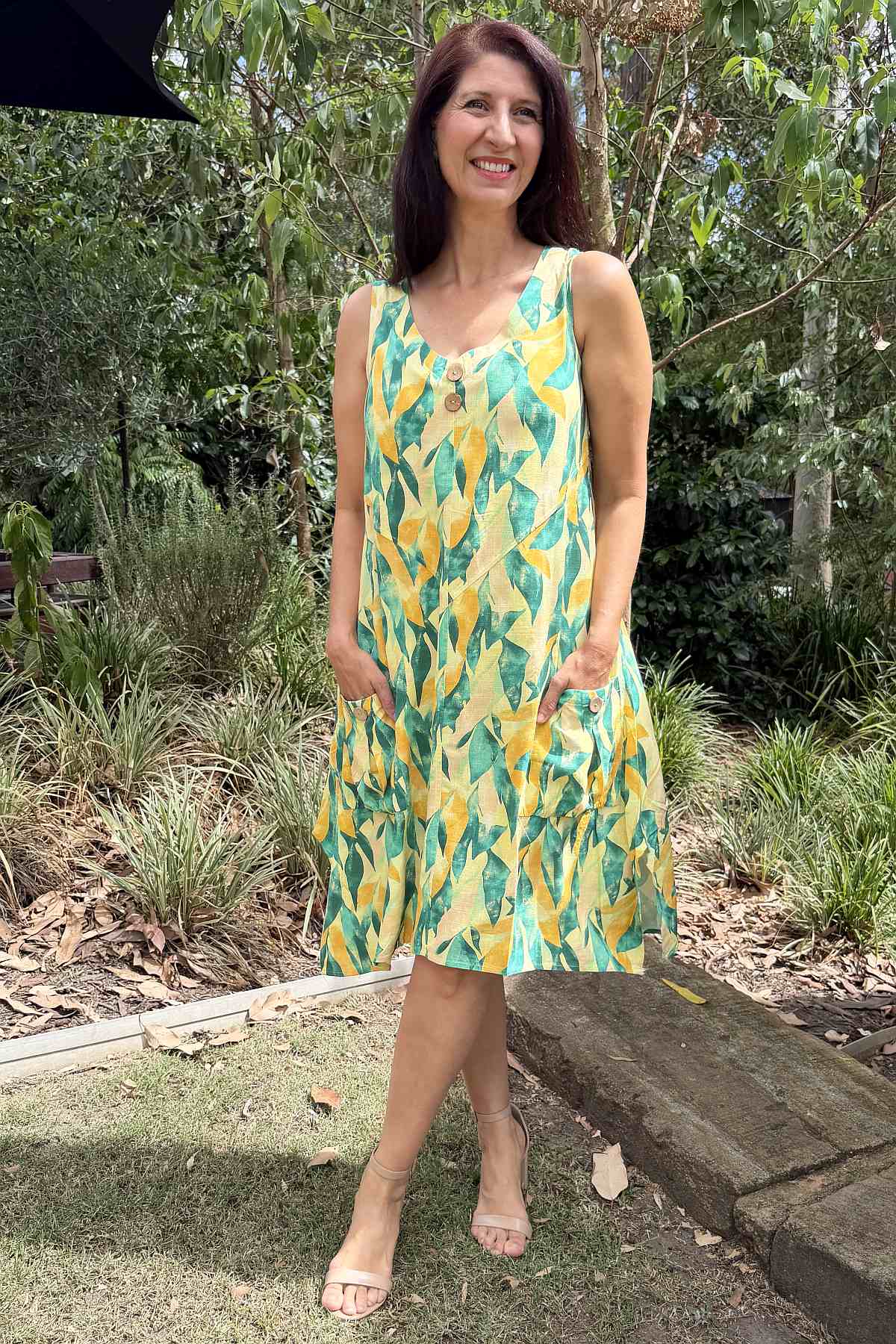 Regular price $69.99Effortless elegance meets everyday comfort in this refined sleeveless tunic dress. Crafted from a premium linen-cotton blend, the fabric drapes beautifully while maintaining its shape, creating a flattering A-line silhouette that skims the body. The light yellow base features a distinctive yellow and green leaf print that brings natural movement to your wardrobe. Practical front pockets add functionality without compromising style, while the V-neckline is finished with a charming coconut button detail. Designed to hang gracefully below the knee, this versatile piece transitions seamlessly from casual outings to relaxed gatherings. Each print pattern is unique, ensuring your piece is truly one-of-a-kind.