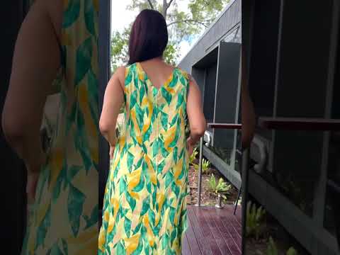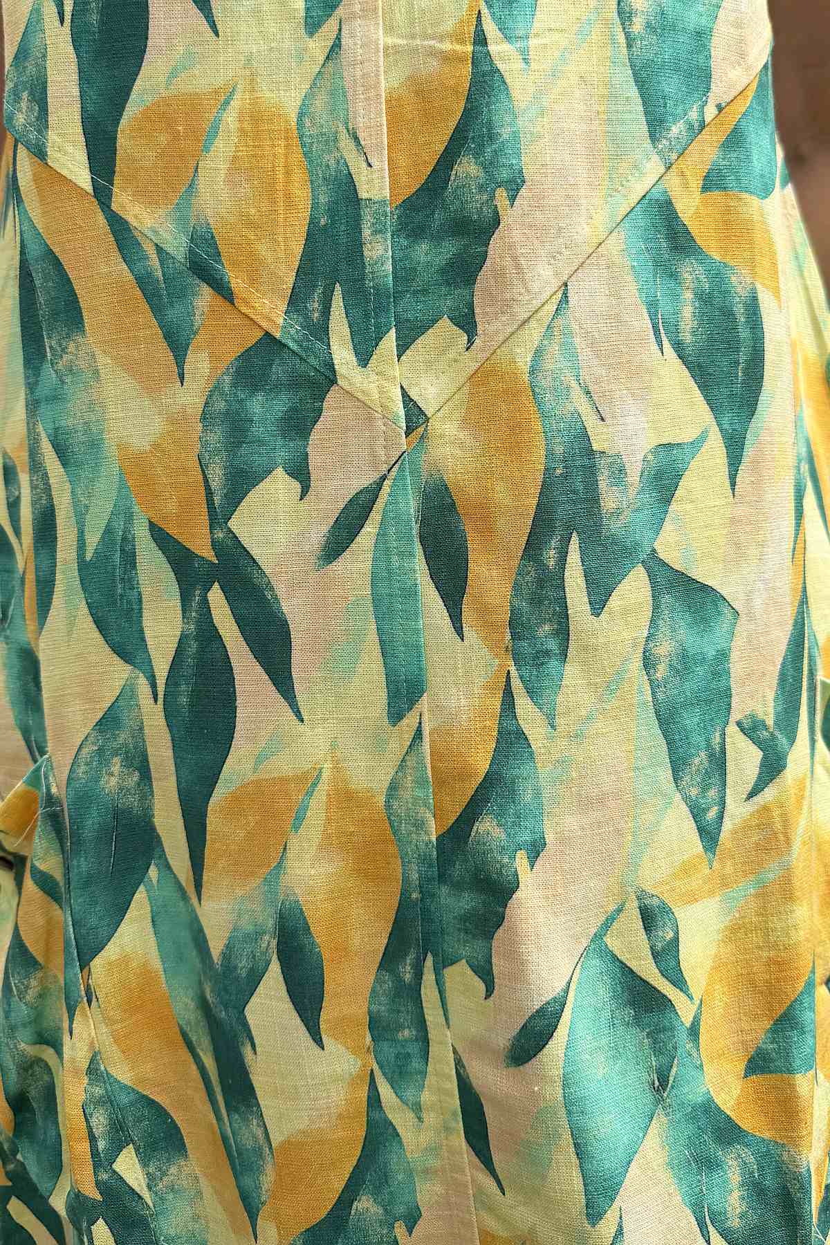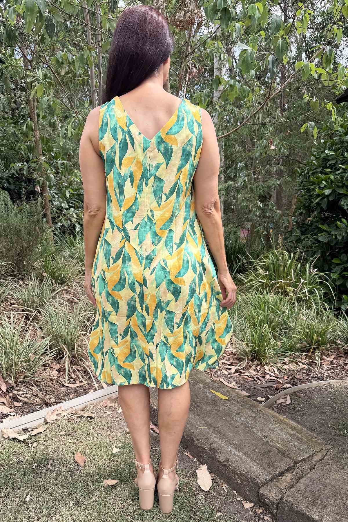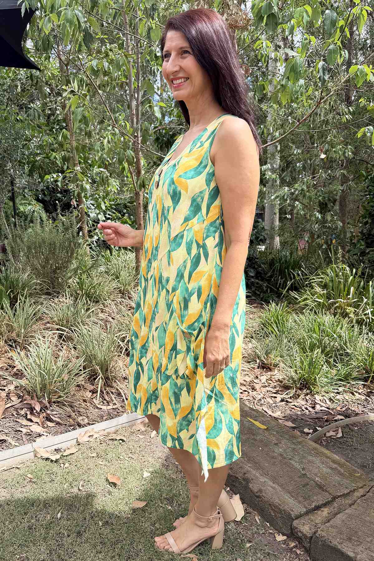 Regular price $69.99Effortless elegance meets everyday comfort in this refined sleeveless tunic dress. Crafted from a premium linen-cotton blend, the fabric drapes beautifully while maintaining its shape, creating a flattering A-line silhouette that skims the body. The light yellow base features a distinctive yellow and green leaf print that brings natural movement to your wardrobe. Practical front pockets add functionality without compromising style, while the V-neckline is finished with a charming coconut button detail. Designed to hang gracefully below the knee, this versatile piece transitions seamlessly from casual outings to relaxed gatherings. Each print pattern is unique, ensuring your piece is truly one-of-a-kind.