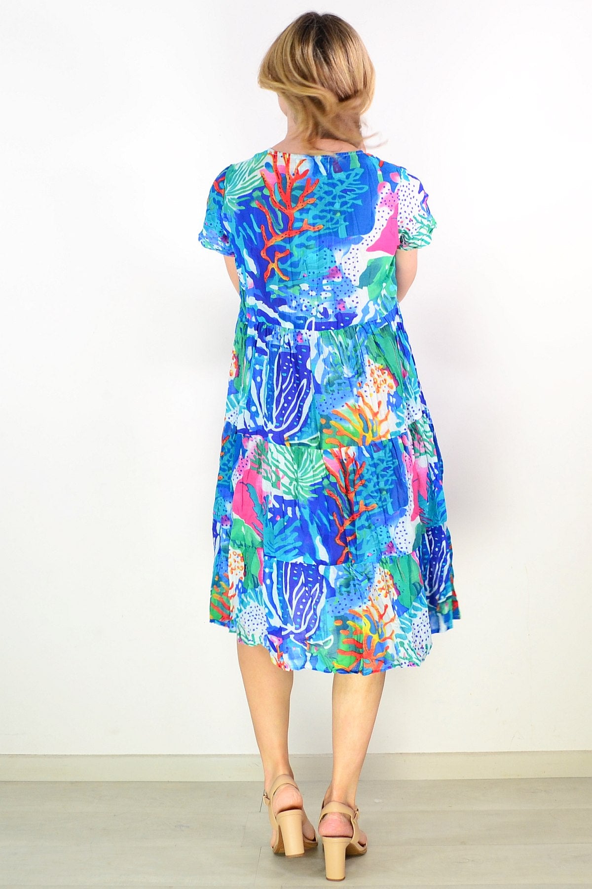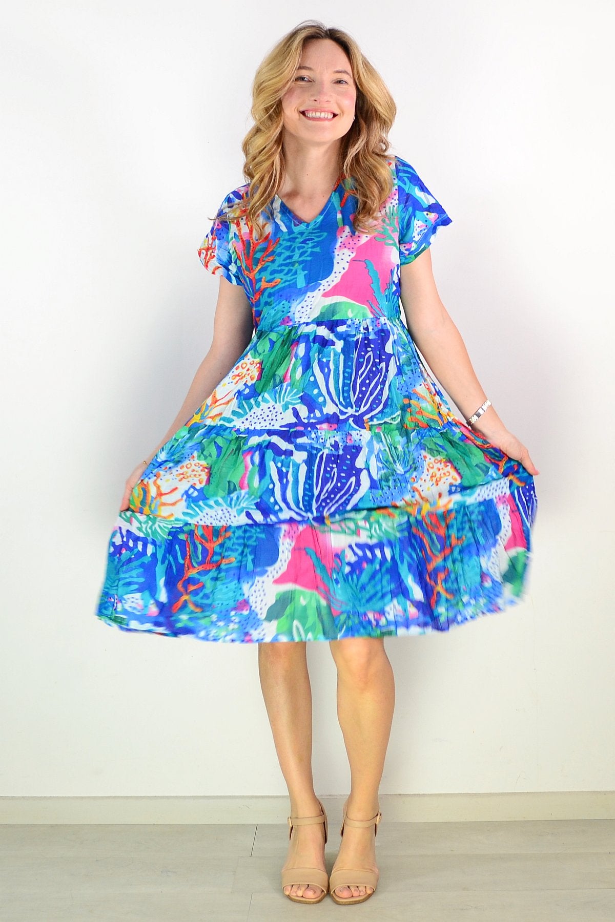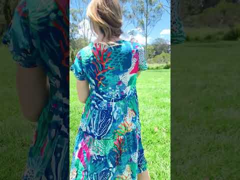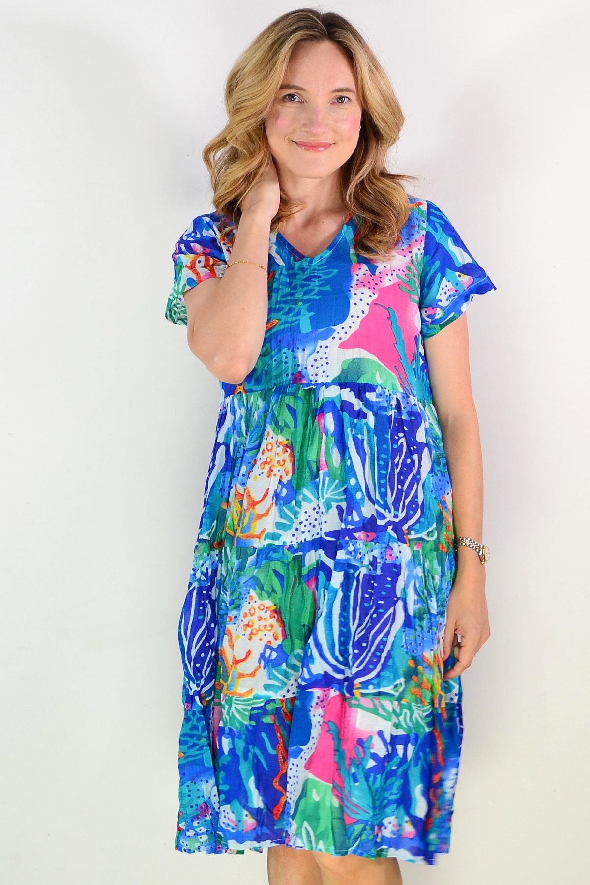 The Thalia Tiered Coral Reef Tunic Dress combines effortless elegance with everyday comfort. Crafted from pure cotton, this relaxed A-line silhouette drapes beautifully with a flattering smock design. Cap sleeves and a refined V neckline create a sophisticated look, while the vibrant coral print—accented with pink, green, white, and blue—brings a refined pop of colour to your wardrobe. Perfect for warm weather styling with understated grace.