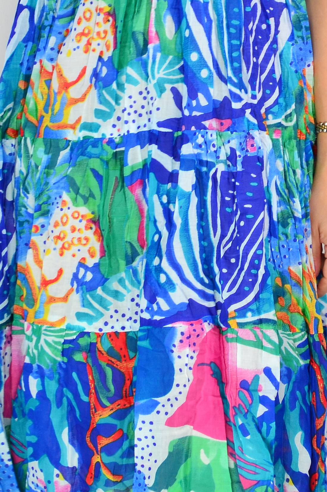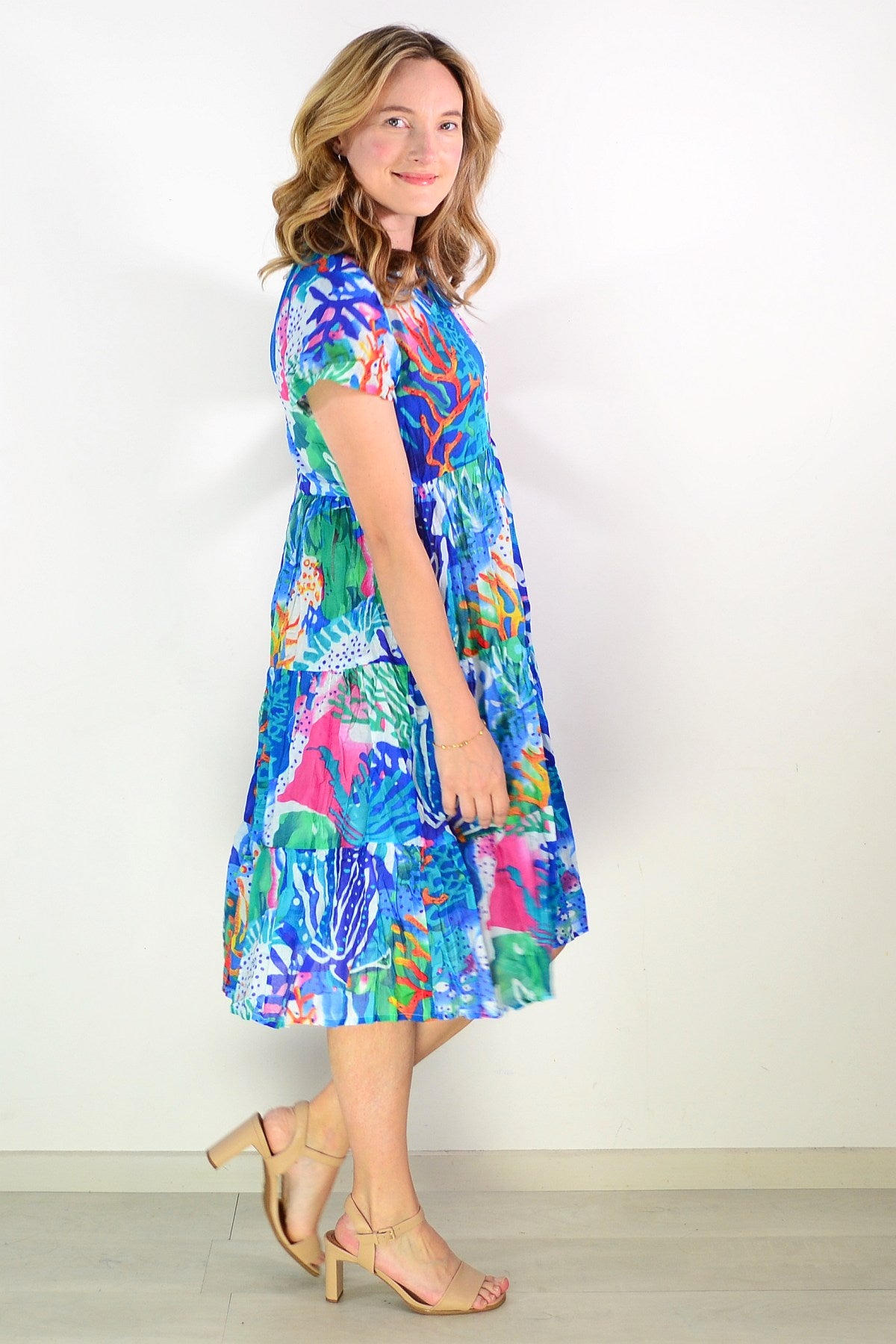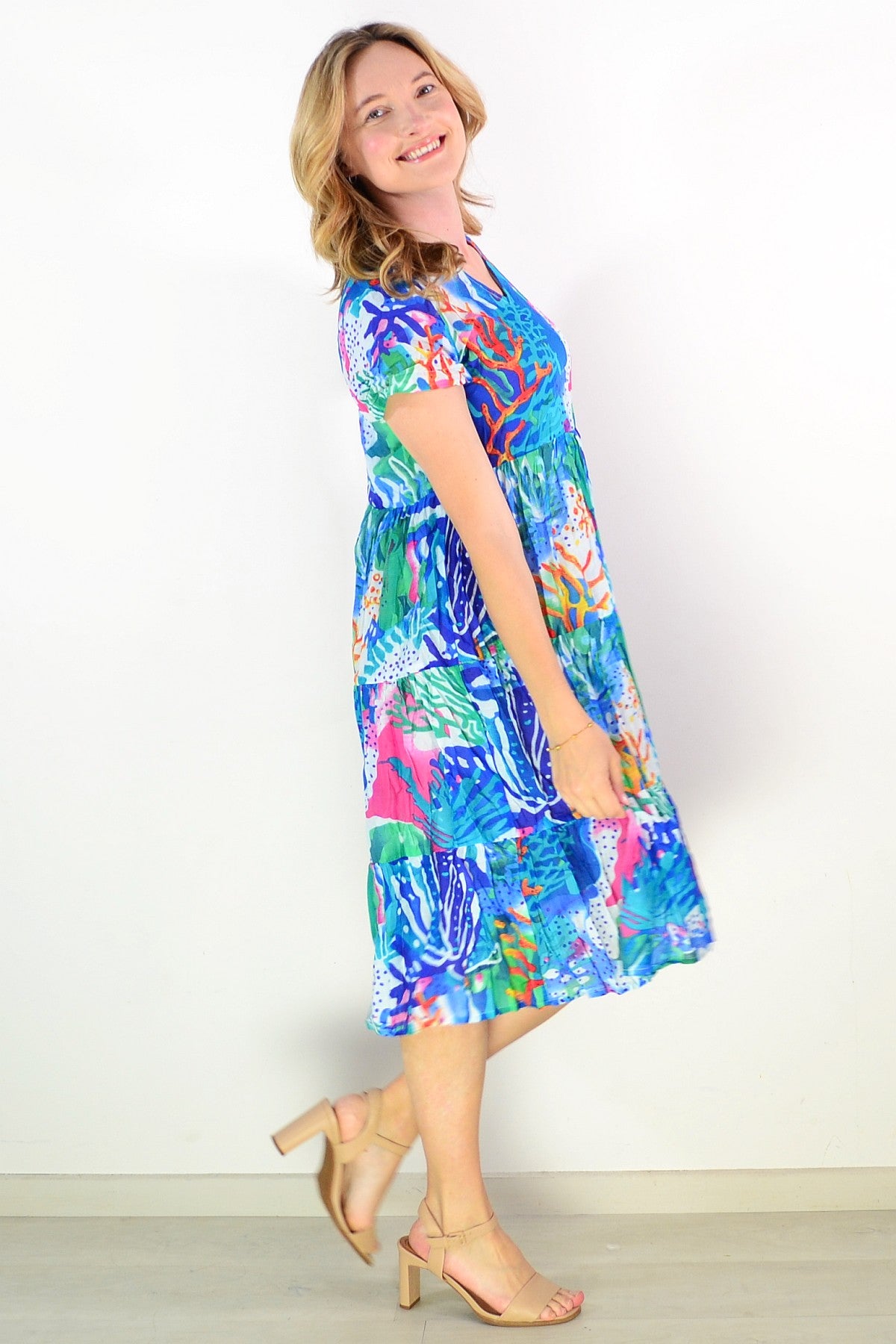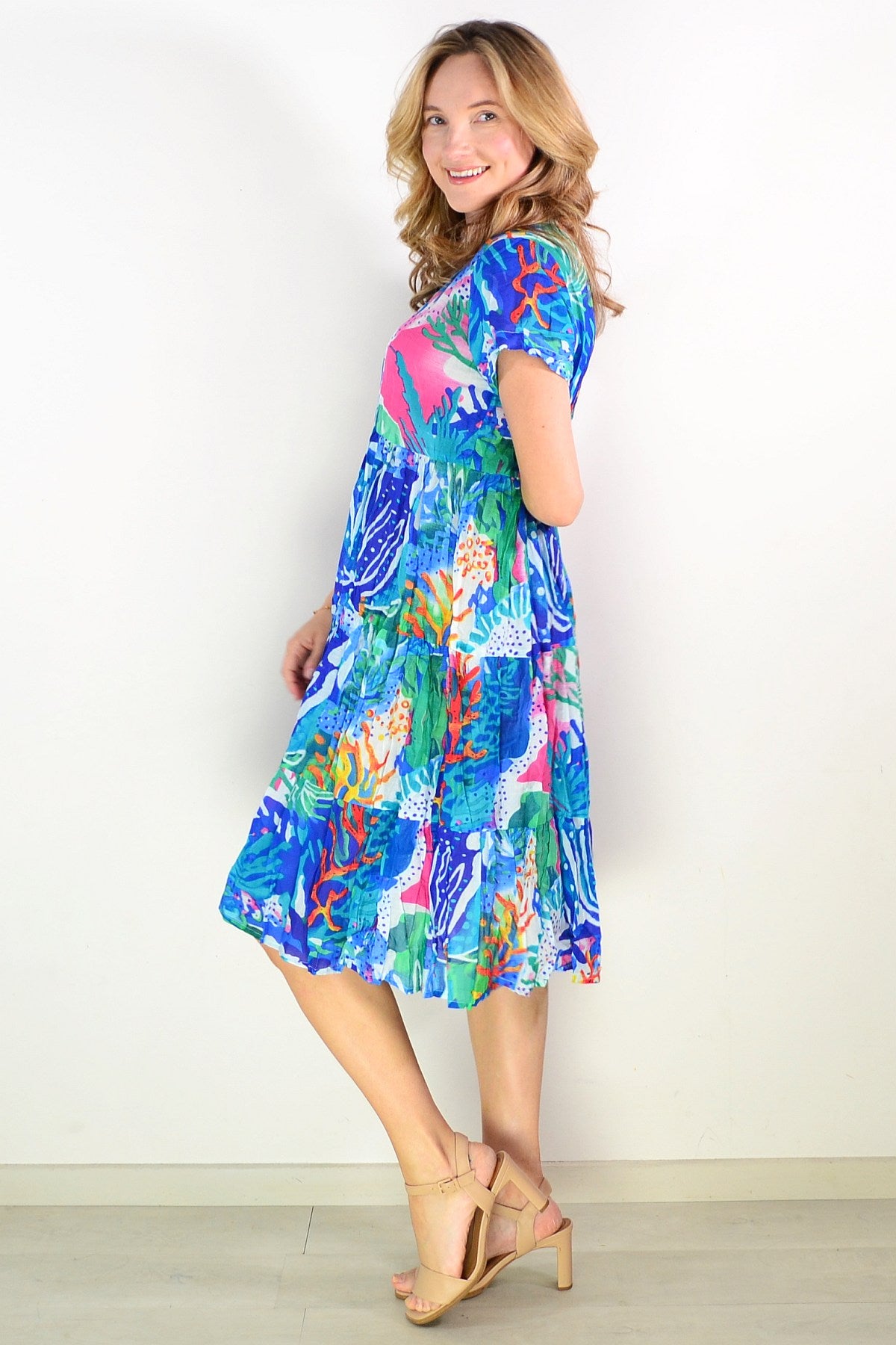 The Thalia Tiered Coral Reef Tunic Dress combines effortless elegance with everyday comfort. Crafted from pure cotton, this relaxed A-line silhouette drapes beautifully with a flattering smock design. Cap sleeves and a refined V neckline create a sophisticated look, while the vibrant coral print—accented with pink, green, white, and blue—brings a refined pop of colour to your wardrobe. Perfect for warm weather styling with understated grace.