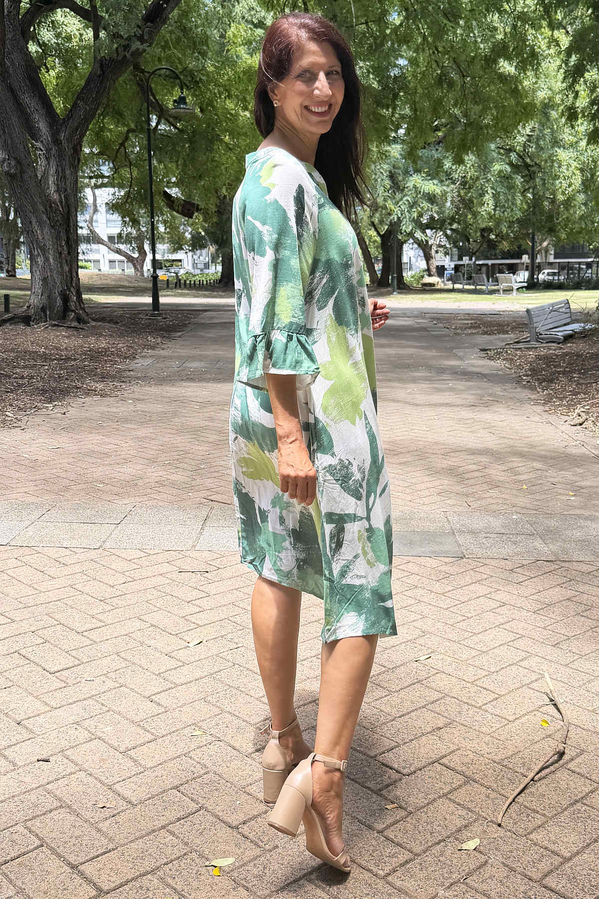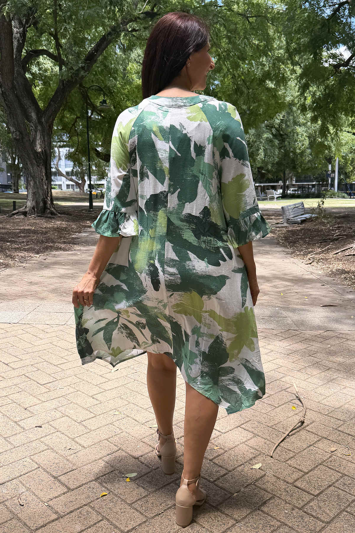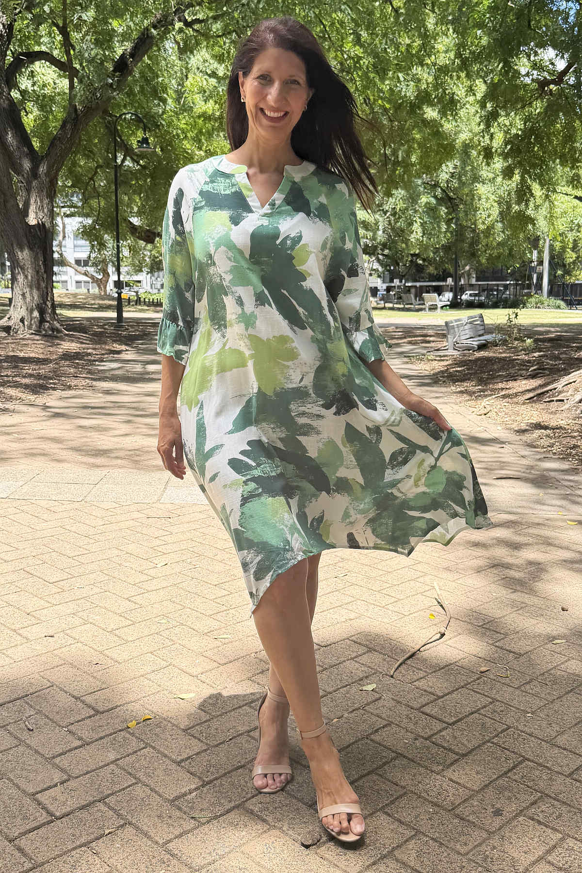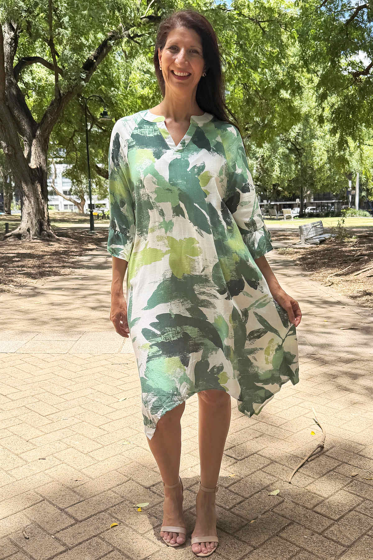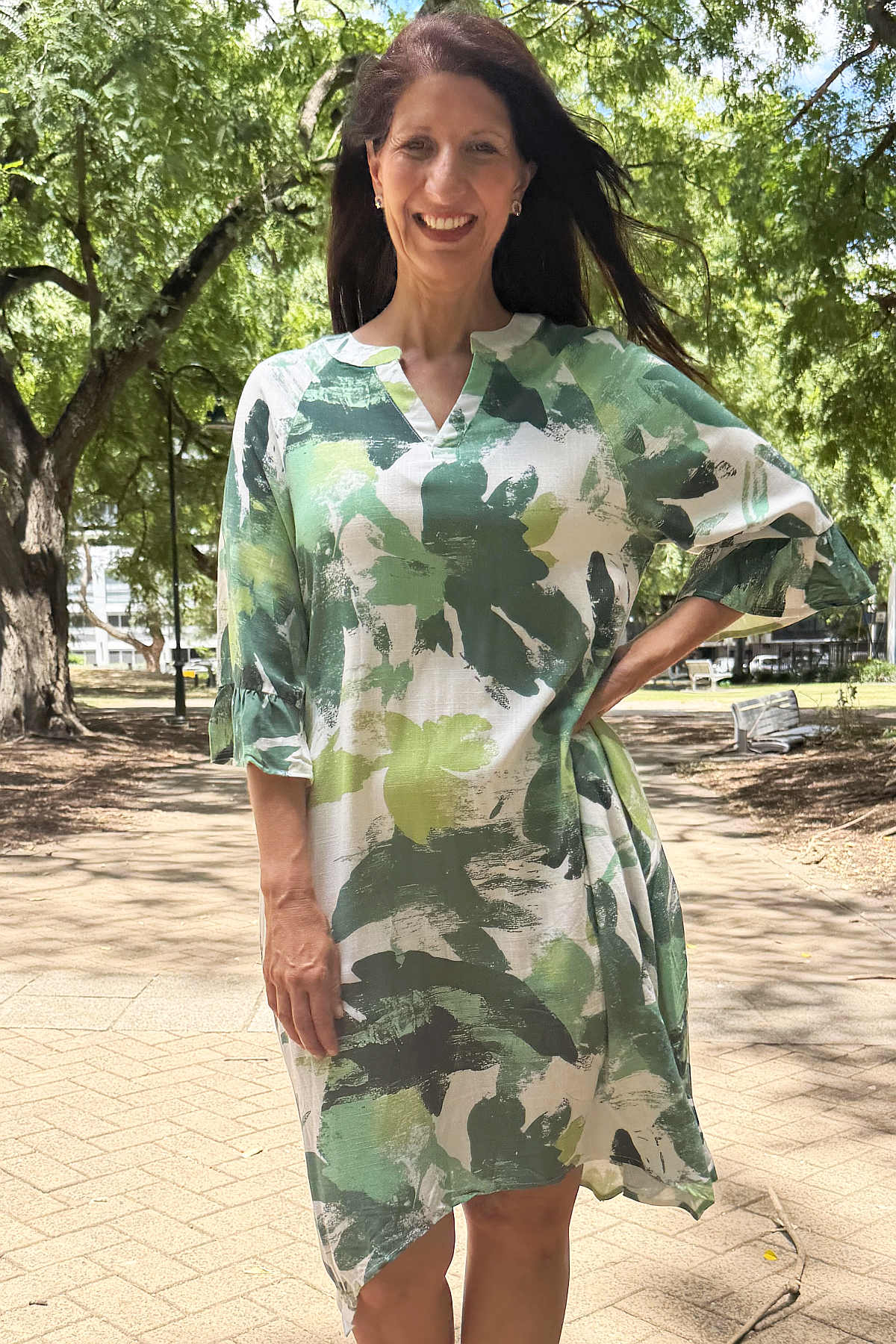 Regular price $69.00Elevate your warm-weather wardrobe with this striking tunic dress, featuring an artistic dark green and lime paint splash design against a crisp white backdrop. Crafted from a premium linen-cotton blend, this lightweight piece offers breathable comfort without clinging or transparency. The sophisticated silhouette includes a Chinese collar with flattering V-neckline, flared elbow-length sleeves, and practical side pockets. Cut to a graceful knee length, it's the perfect balance of contemporary style and timeless elegance for effortless summer dressing.